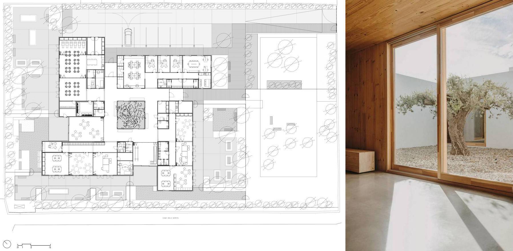 На примере Дневного Центра Альцгеймера в Реусе можно рассмотреть роль «маркера» в формировании объемно-пространственной структуры объекта (рис. 3). Патио с оливой фиксирует композиционный центр здания и является его ярким смысловым элементом. Центральный двор освещает ключевые пути коммуникации, которые задуманы как общественное пространство, всегда сопровождаемое изображением оливкового дерева, создающее атмосферу чувственности и спокойствия. Патио также артикулирует шесть функциональных модулей, каждый из которых имеет свой сад. Открытые пространства запроектированы как часть оздоровительной терапии, сообщаются друг с другом по периметру, не исключая своей приватности. Проектное решение предусматривает сохранение 75% зеленой зоны на участке, что помогает создать контакт с природой, способствующий оздоровлению [6].