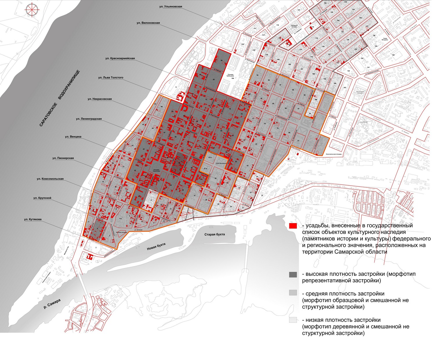 Особенностью исторической центра города Самара является наличие сохранившихся четырех морфотипов регулярной усадебной застройки. Каждый из них радиально расположен относительно ядра – площади Революции. При этом границы каждого уровня плотности отмечены кварталами со смешанной (неструктурной) застройкой. Каждому морфотипу застройки характерны различные параметры по степени сохранности, материалу исполнения, архитектурной стилистике, параметрическим данным и функциональному назначению.