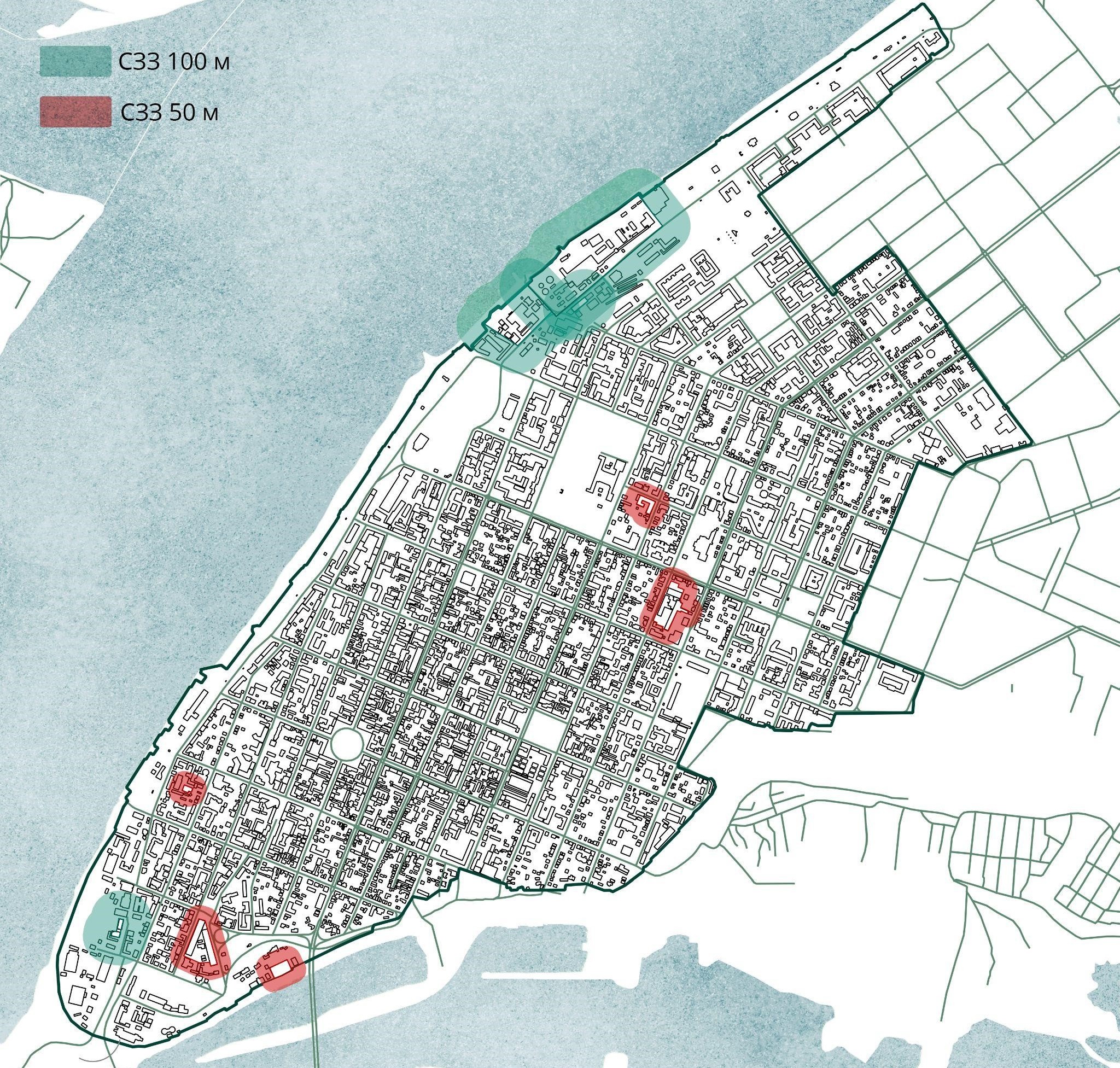 Рис. 3. Санитарно-защитные зоны действующих производственных зданий на территории ИП Самара