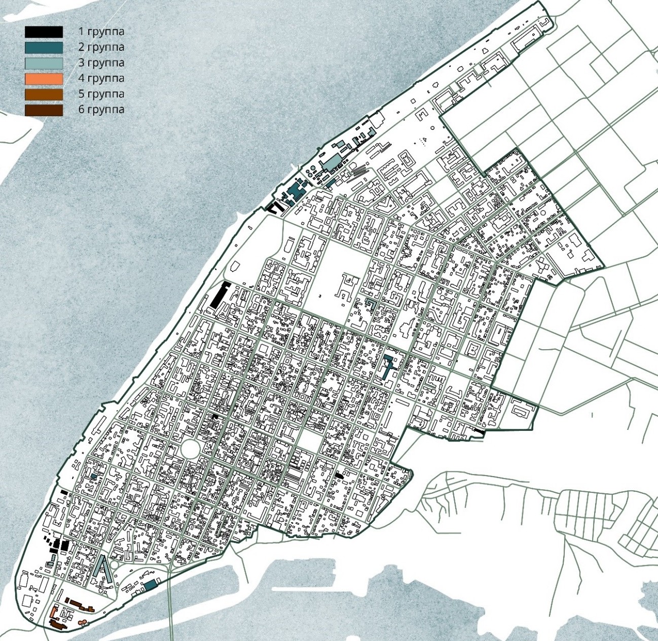 Шестая группа включает в себя здания, не обладающих статусом объекта культурного наследия, не имеющие нематериальную и материальную ценность, т.е. фактически ветхие или разрушенные. К ним относятся бывший корпус завода клапанов, расположенный по адресу: г. Самара, ул. князя Григория Засекина (рядом с 6А) и бывший корпус Мукомольной мельницы Соколовых (ул. Водников, рядом с улицей князя Григория Засекина, 1). Следует рассмотреть расчистку территорий этих объектов и ее дальнейшую застройку с продолжением характерной для исторического поселения городской ткани (жилые здания малой и средней этажности с общественной функцией на 1-м этаже).