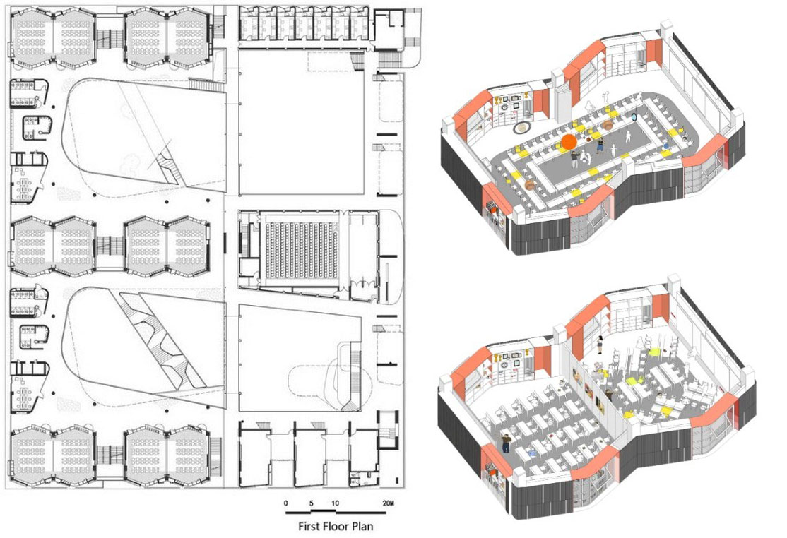 Рис. 1. План учебного заведения Hongling Experimental Primary School и схемы трансформации его учебных блоков
