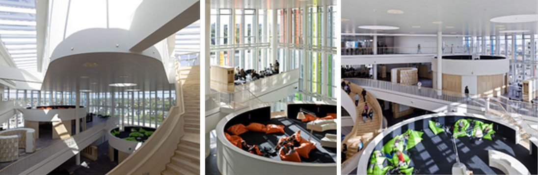 Ørestad Gymnasium в Копенгагене [7] — еще один яркий пример школы, спроектированной с гибкими образовательными пространствами, поддерживающими инновационные подходы к обучению (рис. 4). Пространство гимназии разделено на круглые классы, повторяющие форму атриума, и открытые зоны, идеально подходящие для работы в группах и командных проектов (рис. 5). Зоны легко трансформируются благодаря мобильным элементам — например, перемещаемым книжным полкам, которые позволяют быстро изменять обстановку. Классические классы отделены стеклянными стенами, что поддерживает ощущение открытого пространства и способствует созданию атмосферы единства.