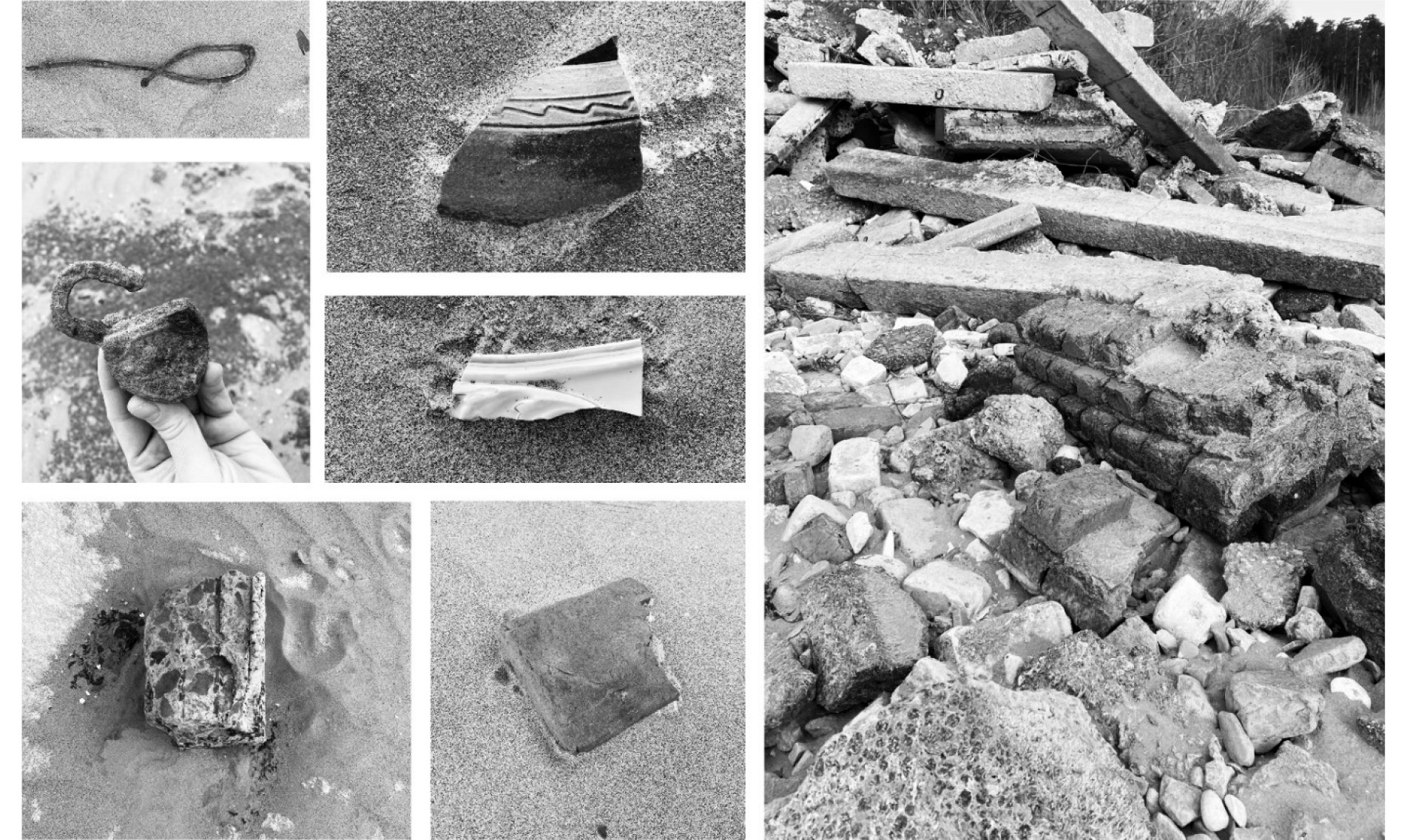 В рамках разработки магистерского исследования было предпринято визуальное обследование и фотофиксация береговой линии между пляжами «Волжский» и «Итальянский». Осенью 2021 г. наблюдался необычайно низкий уровень воды в Жигулевском водохранилище, из-за чего обнажились десятки метров песчаной отмели, сплошь усыпанной артефактами прошлого. Было необходимо подтвердить гипотезу о сохранности фрагментов стен, бутовых фундаментов, каменных блоков, не до конца убранных или использованных в укреплении берега. Были обнаружены осколки глиняной и керамической посуды с узорами и рельефами, истлевшие остовы гробов и гвоздей от них, человеческие останки, а также кирпичи и целые фрагменты сооружений от разрушенных ставропольских зданий (рис. 4). Увиденная картина лишний раз подтвердила догадку, что процесс переноса города оставил травматический опыт, который подсознательно считывается любым чувствующим человеком.
