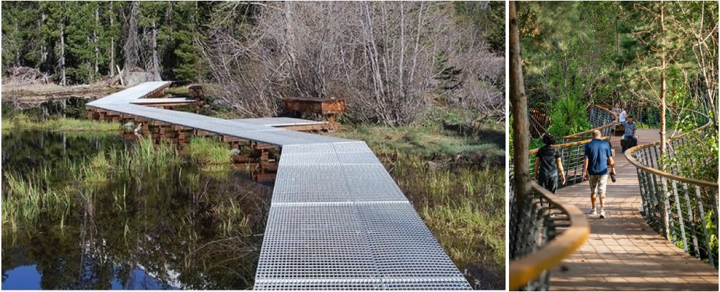 Существуют методы деликатного внедрения в природную среду, без нарушения сложившегося экологического баланса с применением дизайн-технологий, позволяющих нормировать количество людей, взаимодействующих с природой. Для круглогодичного использования территории экопарка все пешеходные маршруты должны быть универсальными, доступными для всех посетителей в любое время года. Арсенал ландшафтных архитекторов постоянно пополняется новыми наработками и технологиями в области универсального дизайна (рис. 6).
