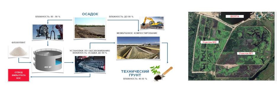 Применяют следующую технологию для обезвоживания осадка влажностью 80 - 90 %: извлечение осадка с влажностью более 80 % с помощью насосного оборудования; подготовительные мероприятия по усреднению влажности извлеченного осадка; обезвоживание осадка до влажности 70 %; перемещение обезвоженного осадка на площадку компостирования. Данная технологическая схема проведения работ позволяет получить достаточно хороший результат, а обезвоженный осадок подготовлен к следующему этапу – мембранному компостированию.