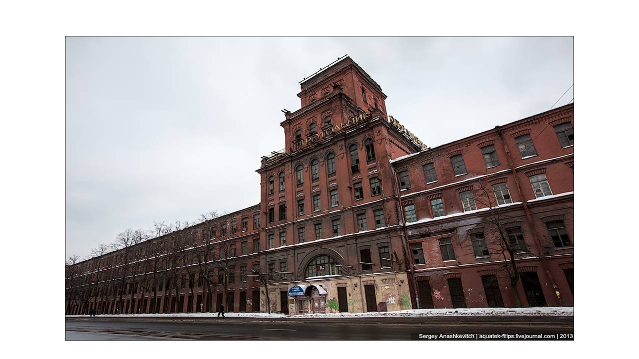Одна из первых отечественных машинных ткацких фабрик основана в 1835 г. Первоначальный проект был заказан в Англии и доработан в Петербурге архитектором Н.Я. Анисимовым под руководством одного из владельцев фабрики А.Я. Вильсона [1, c. 58]. Главное здание состоит из центрального (в глубине двора) и двух боковых симметричных корпусов. Это ранний пример многоэтажного производственного сооружения с внутренним металлическим каркасом.