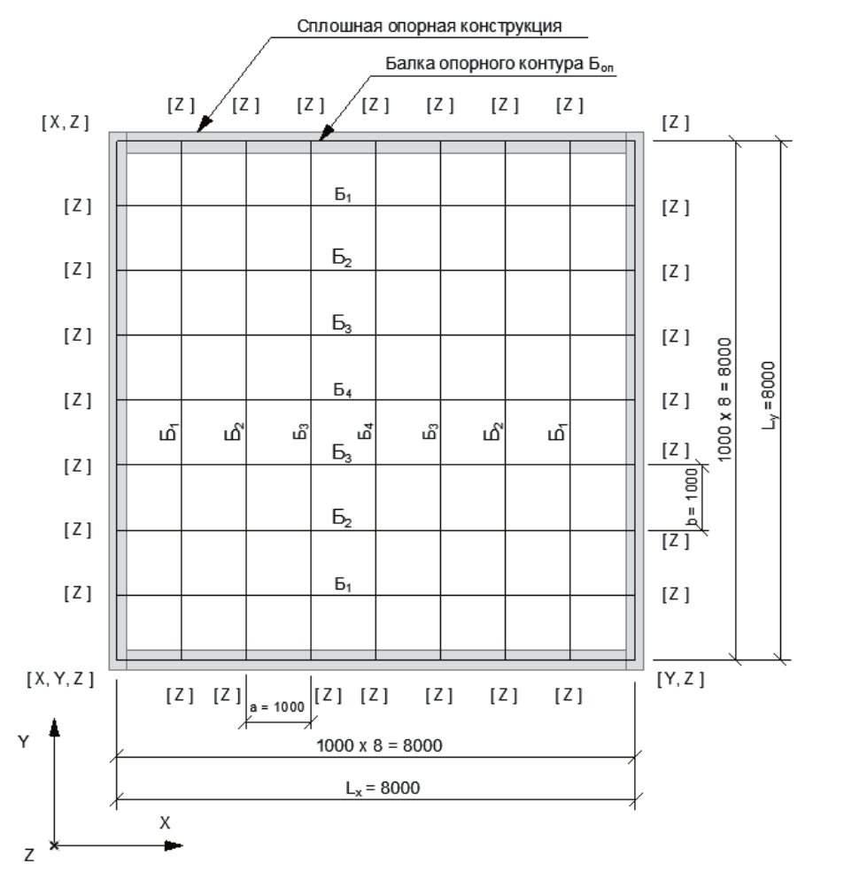 Рис. 1. Схема кессонного перекрытия: Б1, Б2, Б3, Б4 – рассчитываемые балки; [X,Y,Z] – связи, установленные в узлах балки опорного контура