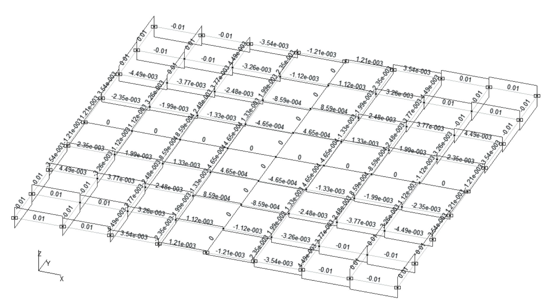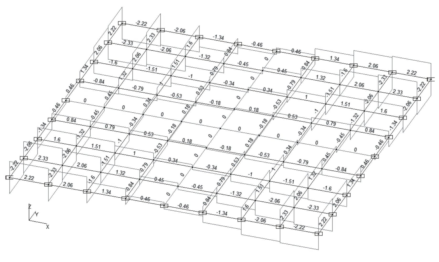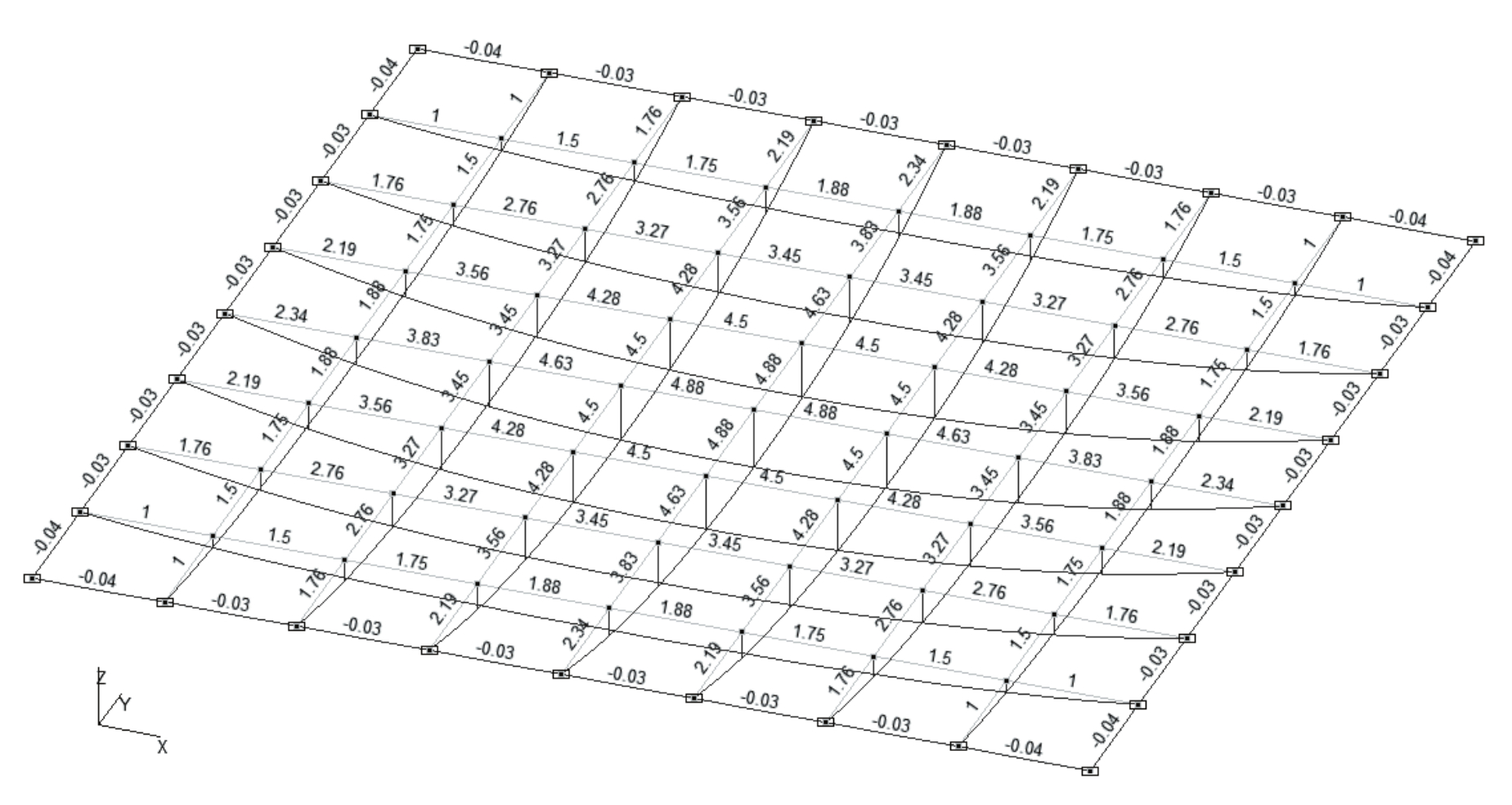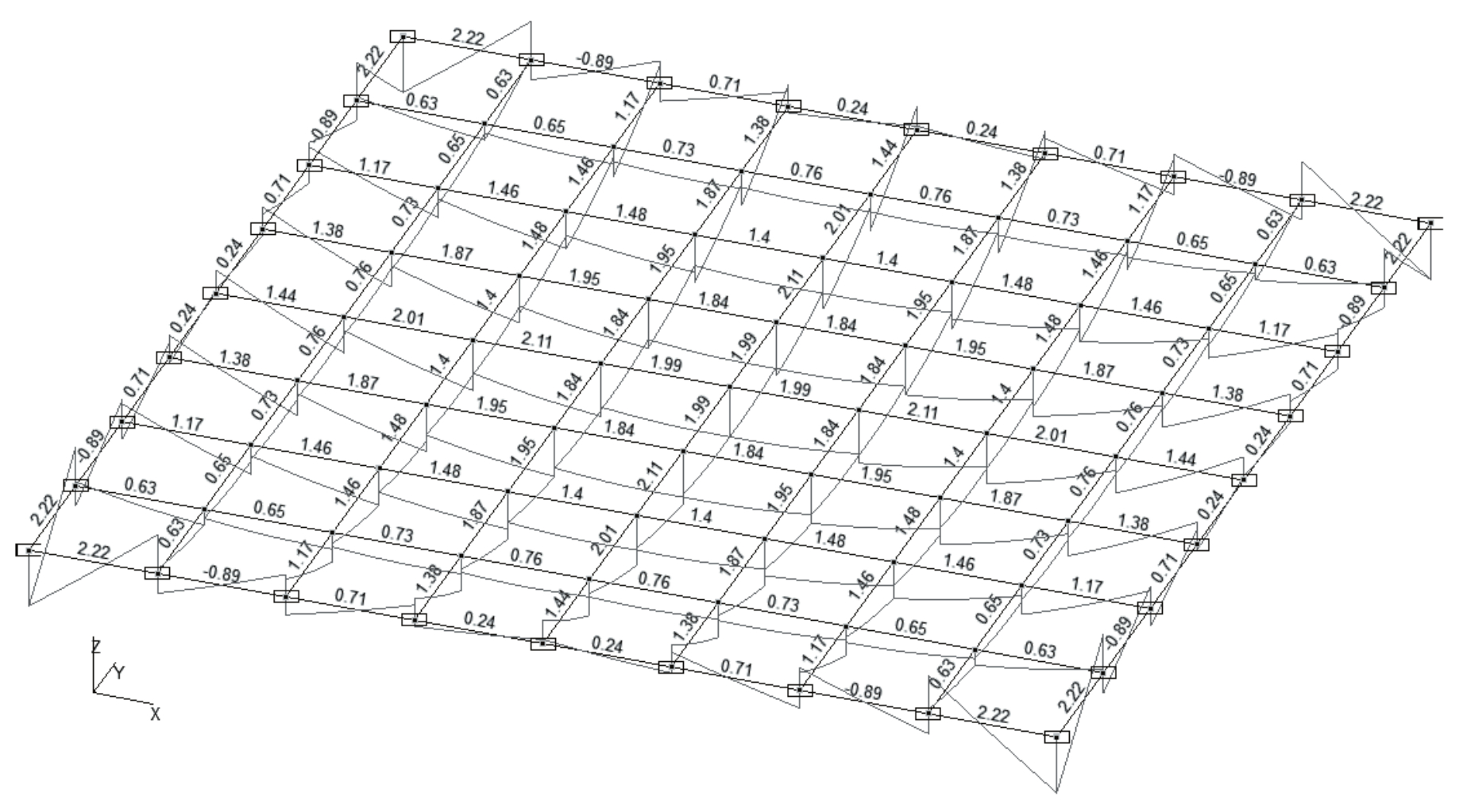 Выводы. 1. Аналитический метод определения усилий в балках прямых кессонных железобетонных перекрытий является неточным, что необходимо учитывать при верификационных вычислениях. Аналитический метод расчета не учитывает наличие крутящих моментов в балках, жесткость опорного контура, их влияние на изгибающие пролетные моменты и прогибы конструкции. Равновесие аналитической расчетной схемы из условия распределения опорных реакций не соблюдается.