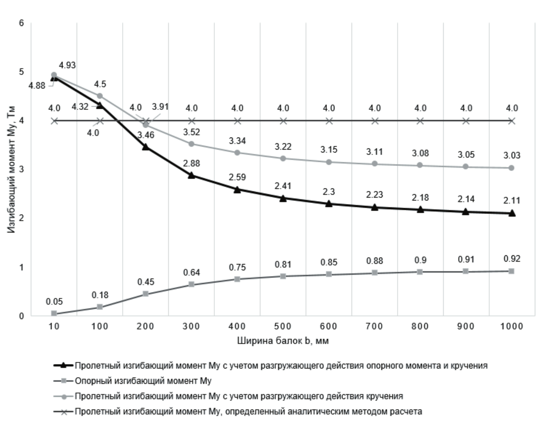 Рис. 6. Графики зависимости максимальных изгибающих моментов My, Тм в центральной балке Б4 кессонного перекрытия в зависимости от ширины балок b