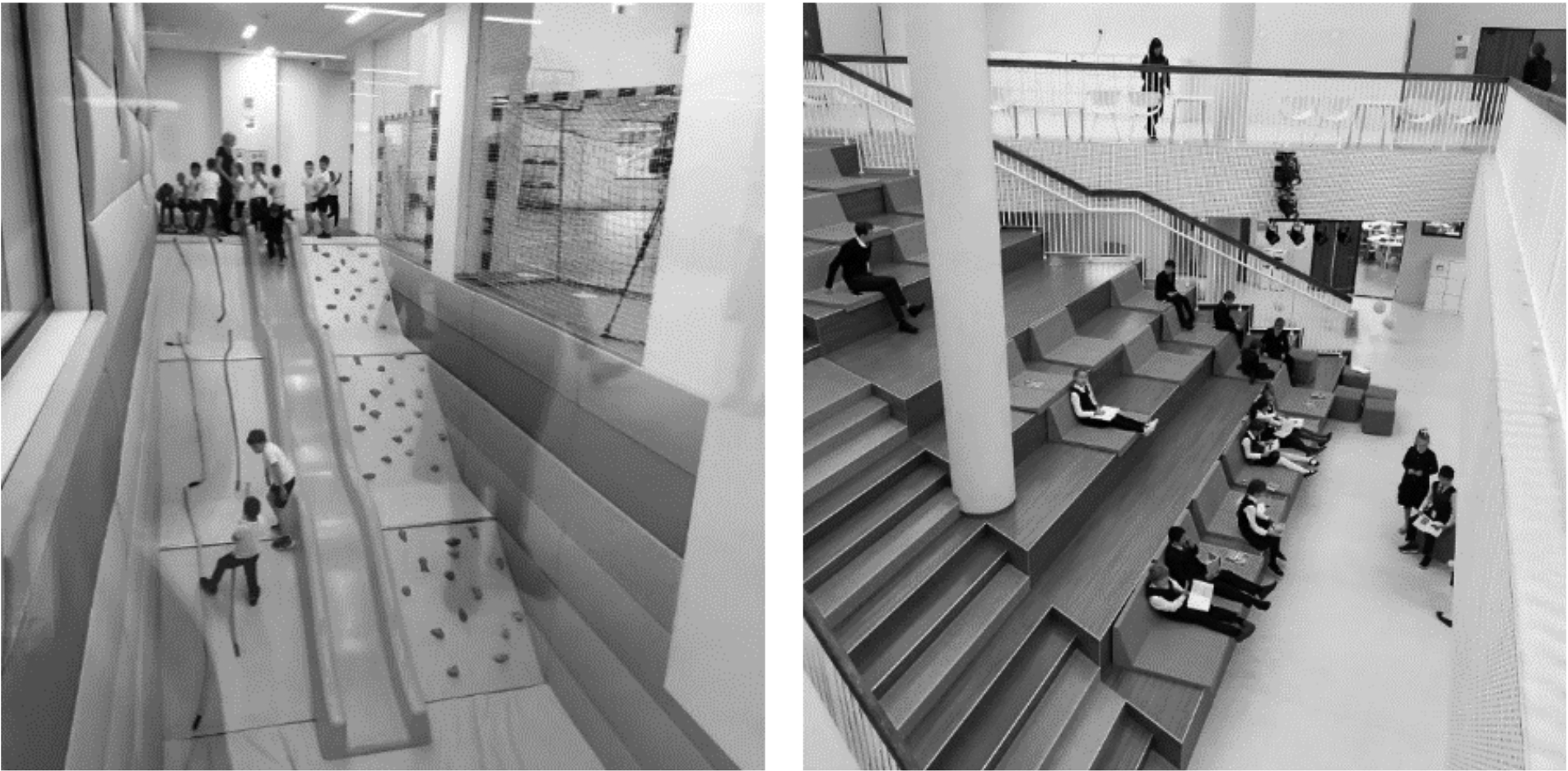 Анализ передового мирового и отечественного опыта проектирования и строительства образовательных комплексов показал, что объединение развитых функциональных блоков через буферные (форумные) пространства в структуре одного объекта является перспективным направлением развития архитектуры образовательных организаций. Использование отдельных помещений как многофункциональных пространств, внедрение в структуру образовательного процесса открытых внутренних дворов и, напротив, включение спортивных объектов в пространство комплекса встречаются в различных примерах проектирования. Также представляется возможным выделить основные особенности современных общешкольных пространств [10–13].