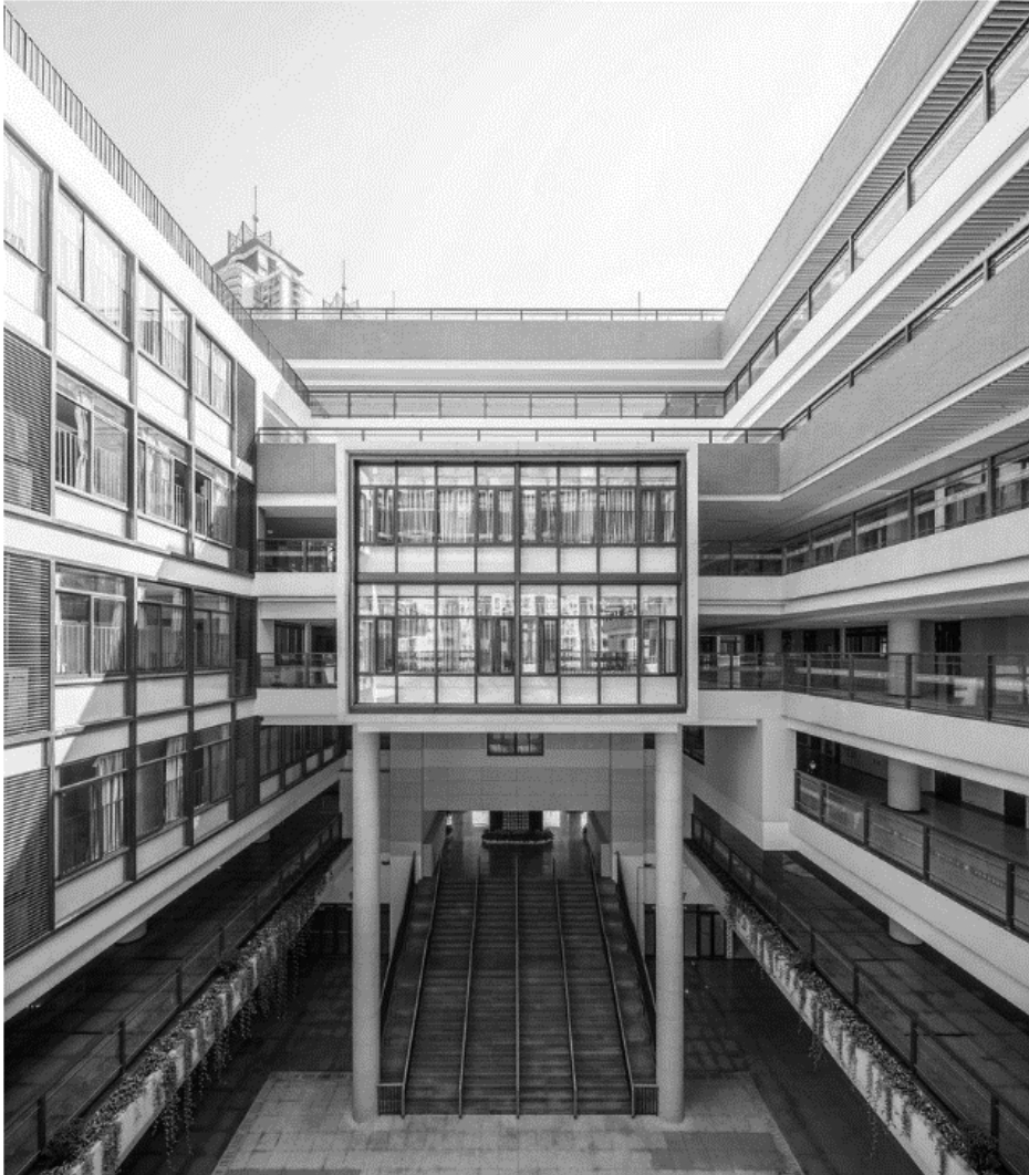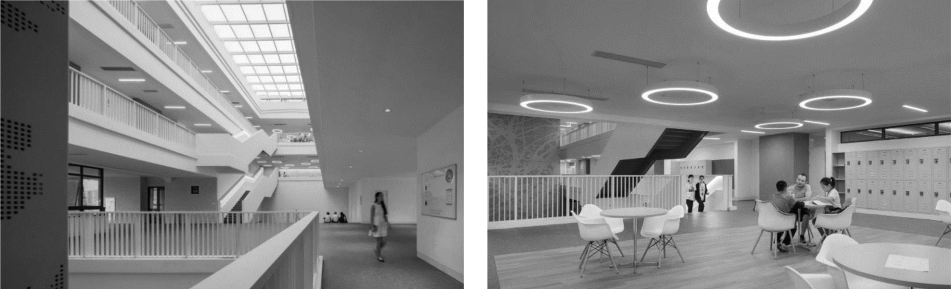 Еще одним из интересных примеров проектирования образовательного комплекса является «Basis International School Park Lane Harbour» в Гуанджоу (Китай). Это школа-интернат, вмещающая 1200 учеников. Площадь застройки составляет 43 000 м², кампуса – 70 000 м². Место кампуса было выбрано в горном лесу на берегу залива Парк-Лейн. Участок покрыт густой растительностью с перепадом высот 58 м, от самого низкого до самого высокого уровня. Между разными высотами существует множество транспортных соединений, что удобно для учителей и учеников в школе. Связи с разными высотными отметками устанавливаются путем полного использования ландшафта участка, что снижает необходимость подъема и спуска. Базисная международная школа состоит из обучающей группы (включая ресторан с обзором на 360 град, крытый спортзал), общежития и спортивной площадки на вершине. Группы общежитий принимают форму башен в стиле рассредоточенных точек [7–10]. По замыслу архитекторов функциональную структуру кампуса можно разделить на две основные группы: базовую среду обучения (с упором на внутренние отношения) и среду межличностного общения (с упором на активный отдых и межличностное общение). Эти две группы определяют внутреннюю и внешнюю среду кампуса. Международные школы применяют модель обучения по выбору класса, и у учащихся нет фиксированной классной комнаты (рис. 6).