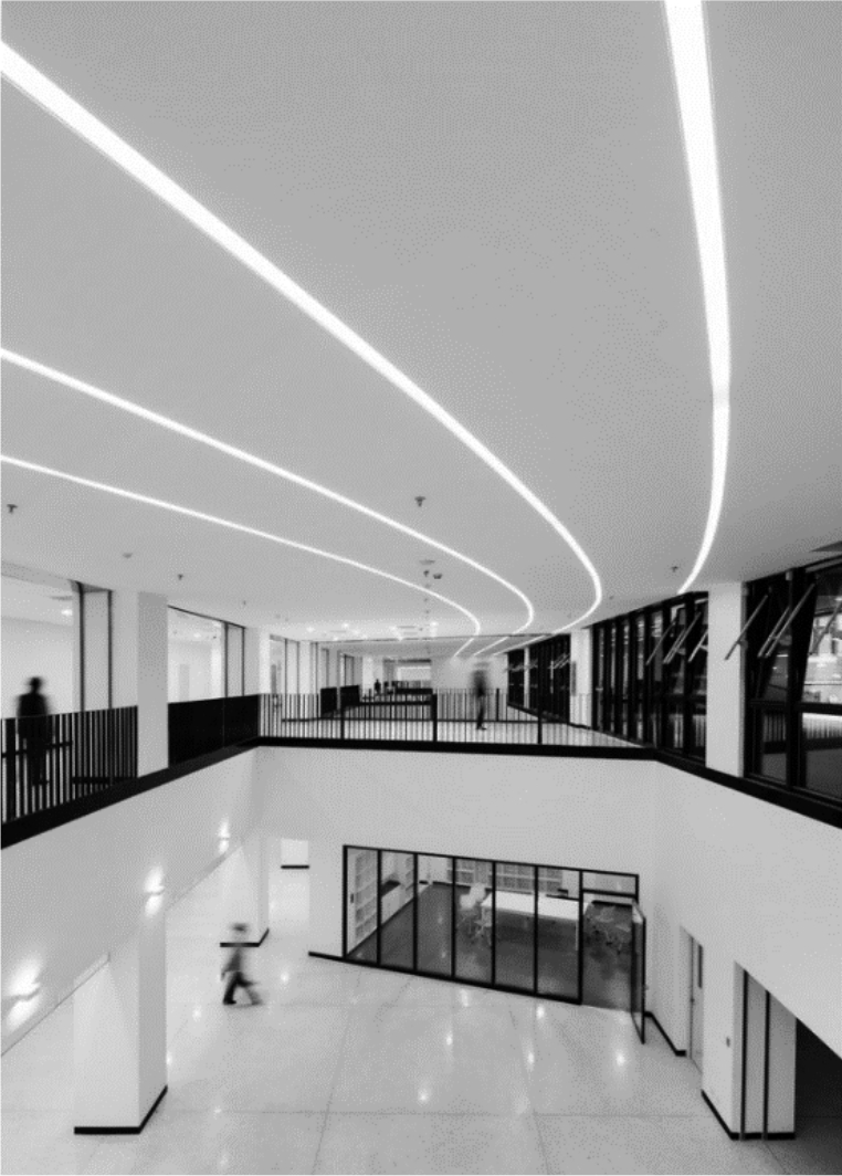 Все основные школьные функции расположены вдоль центрального линейного пространства – горизонтальное коммуникационное пространство, «центральная улица» здания. Это живое, активное пространство, соединяющее основные блоки школьного здания и центральный вход. Объемно-планировочное решение включает остекленное форумное пространство и рекреации повышенной этажности. Планировка современной школы – это «город-в-городе». Городская планировка переосмысливается как свободная композиция форм на основе матричной комбинации открытых, гибких социальных пространств с регулярной планировкой учебных классов как в интерьере, так и в экстерьере здания. Атриумы являются неотъемлемой частью «центральной улицы» и форумного пространства. Атриум во всю высоту – это главный организационный центр, переносящий дневной свет в наиболее удаленные участки школьного здания, а также позволяющий разновозрастным потокам пересекаться и общаться. Использование стеклянных перегородок в зонировании кабинетной структуры позволяет увеличить естественное освещение и придает открытость учебному процессу (рис. 7).