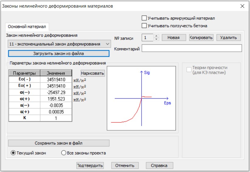Образцы колонн К1, К2 (см. рис. 4) имеют внешний и внутренний радиусы сечения 15 и 10 см соответственно, выполнены из бетона класса по прочности В35 и армируются восемью стержнями диаметром 10 мм класса А500. Длина образцов составляет 0,6 м. Расстояние от края колонны до центра тяжести арматурного стержня равно 2,5 см. Защитный слой бетона составляет 2 см. Эксцентриситет приложения продольной нагрузки для колонны К1 был принят равным 9 см, для колонны К2 – 3 см. При моделировании образцов колонн К1, К2 использовалась экспоненциальная диаграмма деформирования как для бетона, так и для арматуры. Параметры нелинейности бетона и арматуры и их физические характеристики представлены на рис. 5–7.