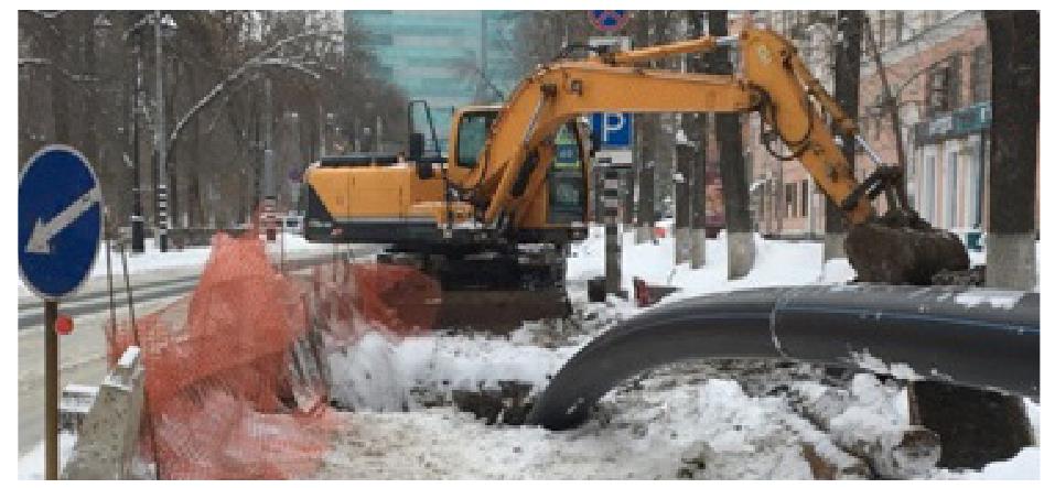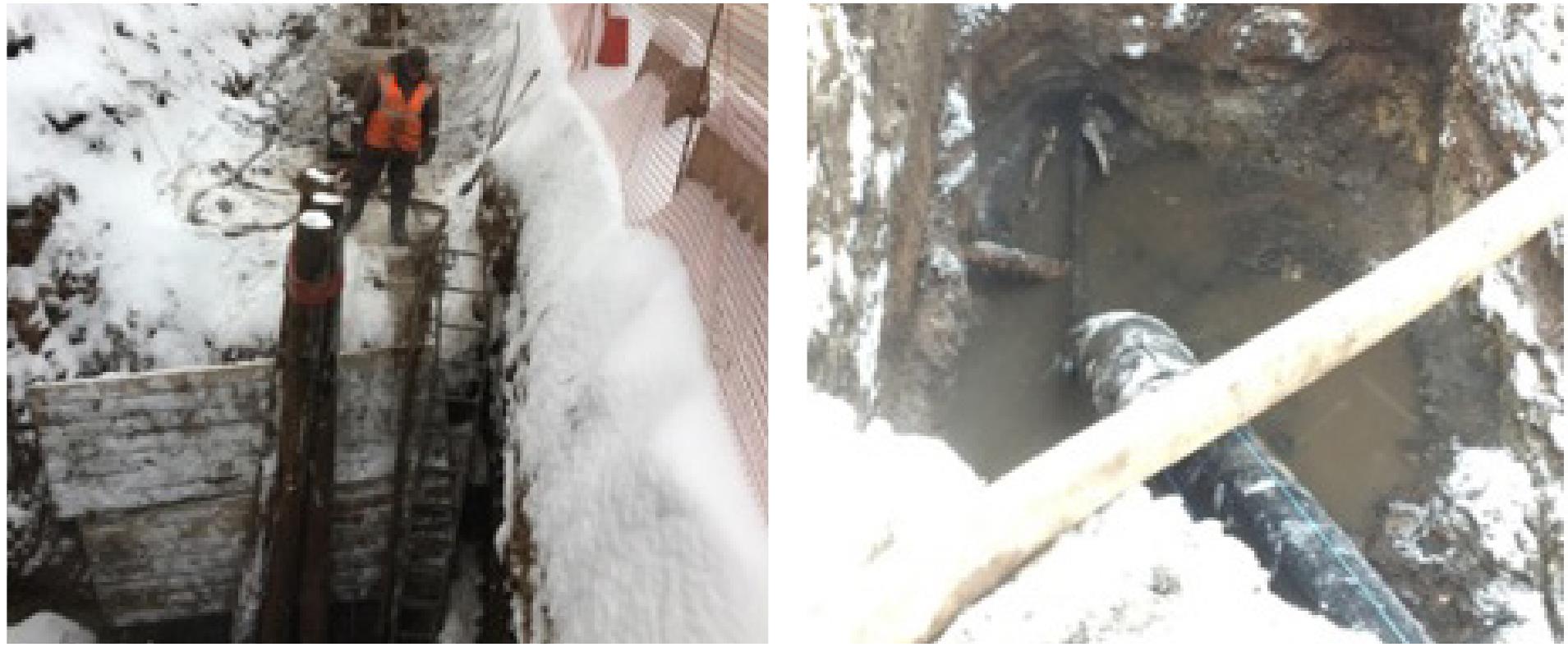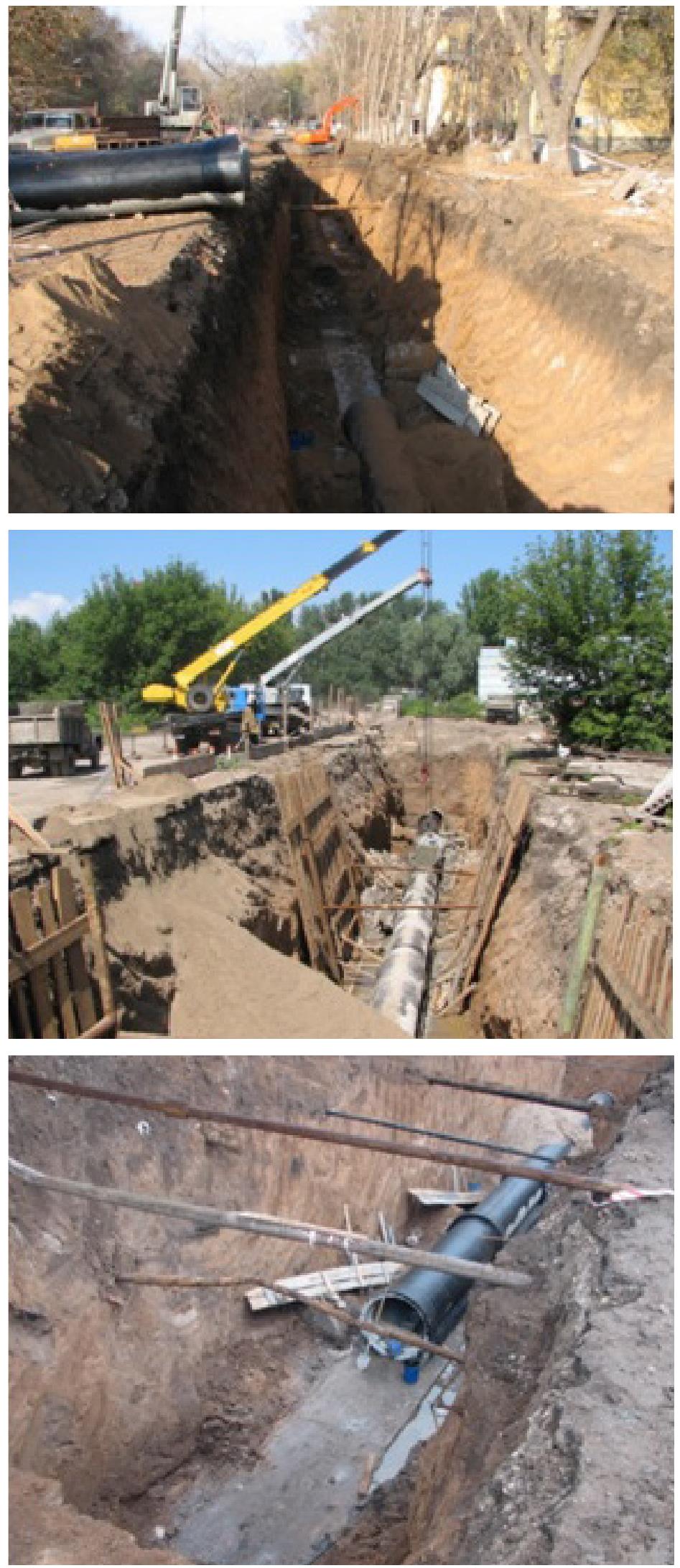 На рис. 5 представлена фотография процесса разработки экскаватором траншеи для перекладки аварийного участка бытовой канализации из керамических труб диаметром 300 мм на Волжском проспекте в Самаре (июль 2021 г.). Глубина заложения трубопровода на этом участке составляет около 8 м, что послужило причиной разрушения трубопровода, смонтированного более 50 лет назад при совершенно другой организации рельефа местности. Учитывая большую значимость Волжского проспекта в организации дорожного движения в городе, ООО «Самарские коммунальные системы» было принято решение провести реновацию всего участка старой канализации длиной 980 м, проходящего в полосе автодороги по Волжскому проспекту, методом протягивания нового полиэтиленового трубопровода с предварительным разрушением старого, построенного из керамических труб. Необходимо отметить, что при применении этого метода, как и ряда других современных методов восстановления (реновации) трубопроводов, требуется осуществлять разработку грунта открытым способом (для устройства стартовых и приемных котлованов для размещения рабочего оборудования), но гораздо в меньших размерах. На рис. 6 представлены фрагменты строительно-монтажных работ (декабрь 2021 г.) по реновации старой бытовой канализации на Волжском проспекте, выполненных строительной организацией ООО «СМП».