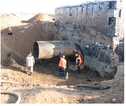 Рис. 4. Врезка нового канализационного коллектора 1400 мм в камеру переключения на выходе трех дюкеров через р. Самару в процессе реконструкции Безымянского коллектора