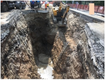 Рис. 5. Разработка траншеи экскаватором на Волжском проспекте в процессе перекладки аварийного участка бытовой канализации диаметром 300 мм