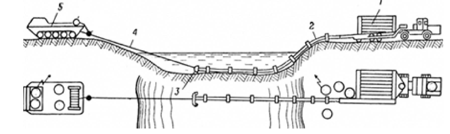 1 – экскаватор; 2 – протягиваемый нефтепровод; 3 – головка; 4 – тяговый трос; 5 – тяговая лебедка