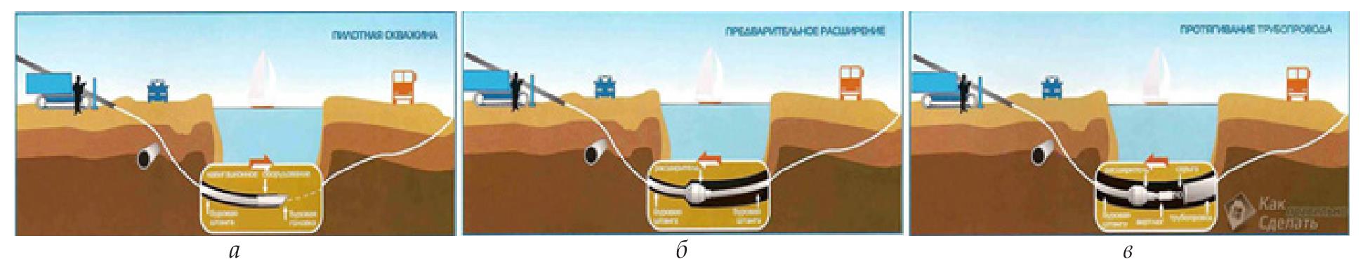 Рис. 6. Укладка наклонно-направленного бурения:а – образование пилотной скважины; б – предварительное расширение скважины; 3 – протягивание трубопровода