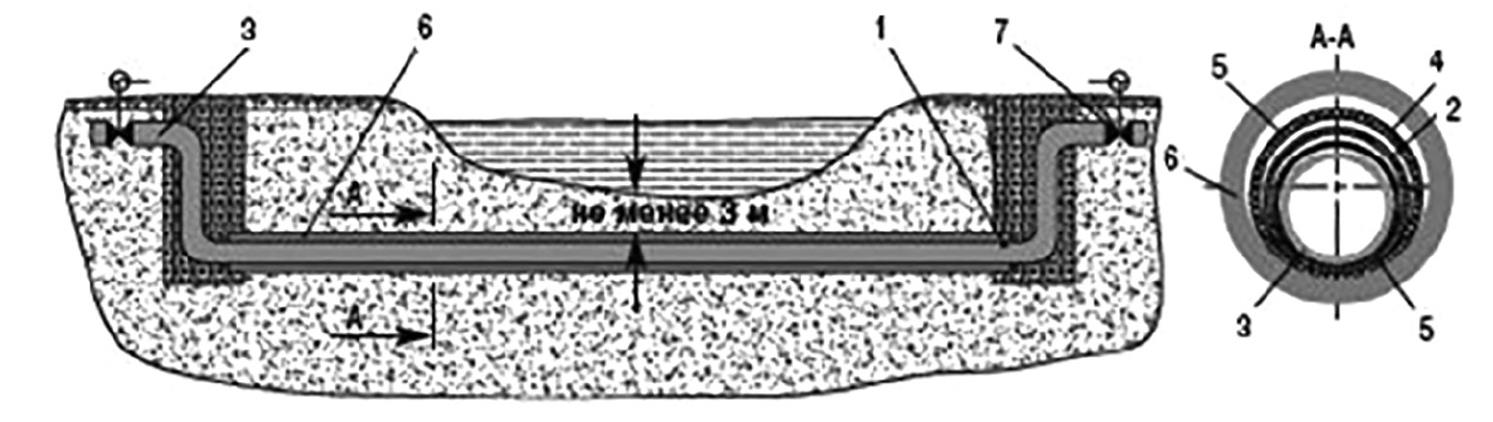 1 – датчик, предназначенный для измерения давления; 2 – железобетонная труба; 3 – нефтепровод; 4 – пространство с инертно-газовой смесью; 5 – полиэтиленовый трубопровод;6 – тоннель; 7 – крановый узел