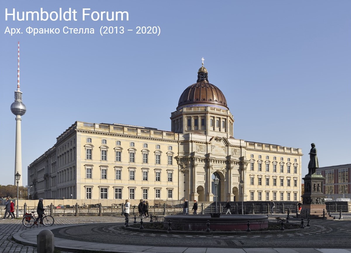 Итальянский архитектор Франко Стелла завершил реконструкцию Берлинского городского дворца в стиле барокко, который ранее был резиденцией для прусских королей и немецких императоров, теперь в этом здании размещается Культурный форум (Humboldt Forum Museum).