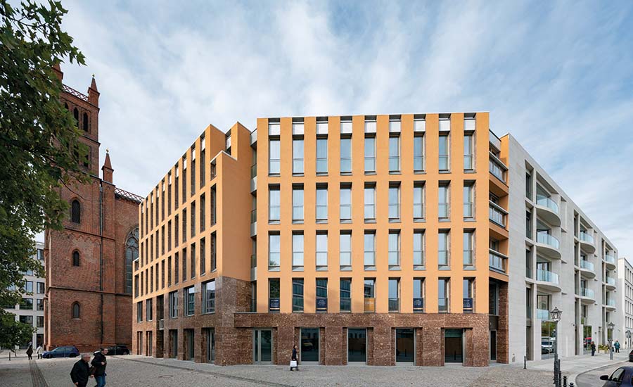 Прекрасным примером, иллюстрирующим этот принцип, является новое офисно-жилое здание, построенное между Церковью Фридрихсвердера и Строительной академией Карла Фридриха Шинкеля. Уважительное отношение к контексту выражено в пропорциях и строительных материалах. Это здание является словно посредником между двумя памятниками архитектуры, и в таком месте оно по праву заслуживает особого внимания. Непростой подход к проектированию определяется самим окружением. Здание в прямом смысле слова многолико и многогранно, ведь в проектировании принимали участие сразу три именитых архитектурных бюро, среди которых, в том числе, выступал один из Притцкеровских лауреатов – Рафаэль Монео. Три совершенно разные концепции сливаются воедино в одном здании. Боковые фасады, обращенные на улицы Шинкельплатц и Нидерлагштрассе, спроектировали известные в Германии архитектурные бюро Schultes Frank Architekten и Hemprich Tophof, а центральный фасад, объединяющий все три фасада в общую концепцию и создающий эффект максимальной выразительности, – Bieniussa/Martinez Architects в партнерстве с Рафаэлем Монео. Для мастера такого уровня руководство по внутреннему плану города было не препятствием, а скорее вдохновением для убедительного дизайна. «Даже когда все кажется предопределенным, есть достаточно места для архитектурного вмешательства», – говорит Рафаэль Монео [6].