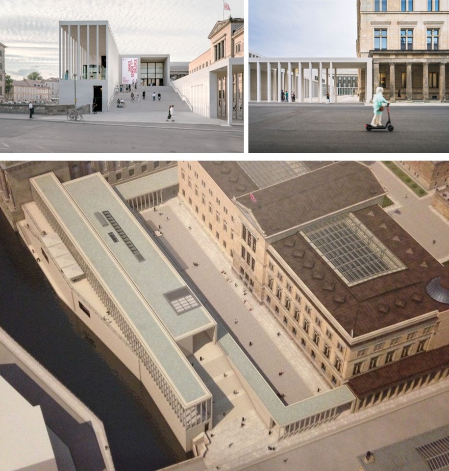 Вторым примером потрясающе гармоничного «Нового» в диалоге со старым представляется здание Галереи Джеймса Саймона архитектора Дэвида Чипперфильда (1999–2018). Здание расположено на узком, долгое время пустующем участке земли, где до 1938 г. находилось административное здание Карла Фридриха Шинкеля. Хорошая архитектура заполняет существующие пустоты в ткани города, плохая создает вокруг себя новые. Продолжая архитектуру Фридриха Августа Шталера, Галерея Джеймса Саймона служит новым входным зданием на музейный остров, завершая ансамбль между каналом и зданием нового музея.