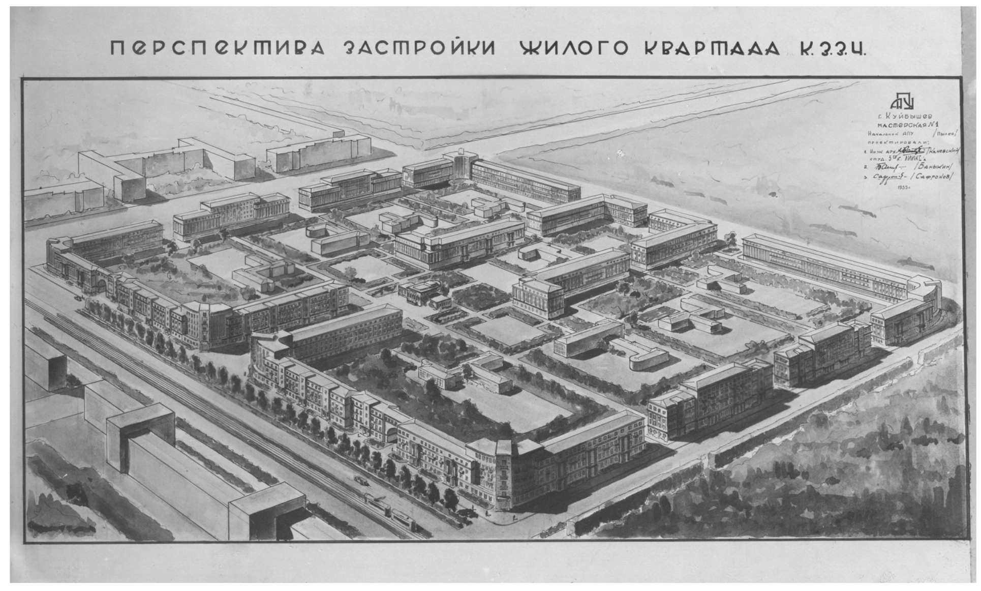 Квартал Куйбышевского завода запасных частей (КЗЗЧ) стал первой очередью строительства Районного центра нового промышленного района г. Куйбышева, проект которого разработан в 1935 году мастерской № 1 АПУ г. Куйбышева под руководством А.Л. Каневского (исполнители студенты Ленинградского института инженеров коммунального строительства Сафронов и Баныкин). Параллельно этим же коллективом разрабатывался проект второго квартала КЗЗЧ, который также выходил своим фасадом на 2-ю Безымянную улицу (ул. Победы), симметрично от центральной композиционной оси центра (рис. 3).