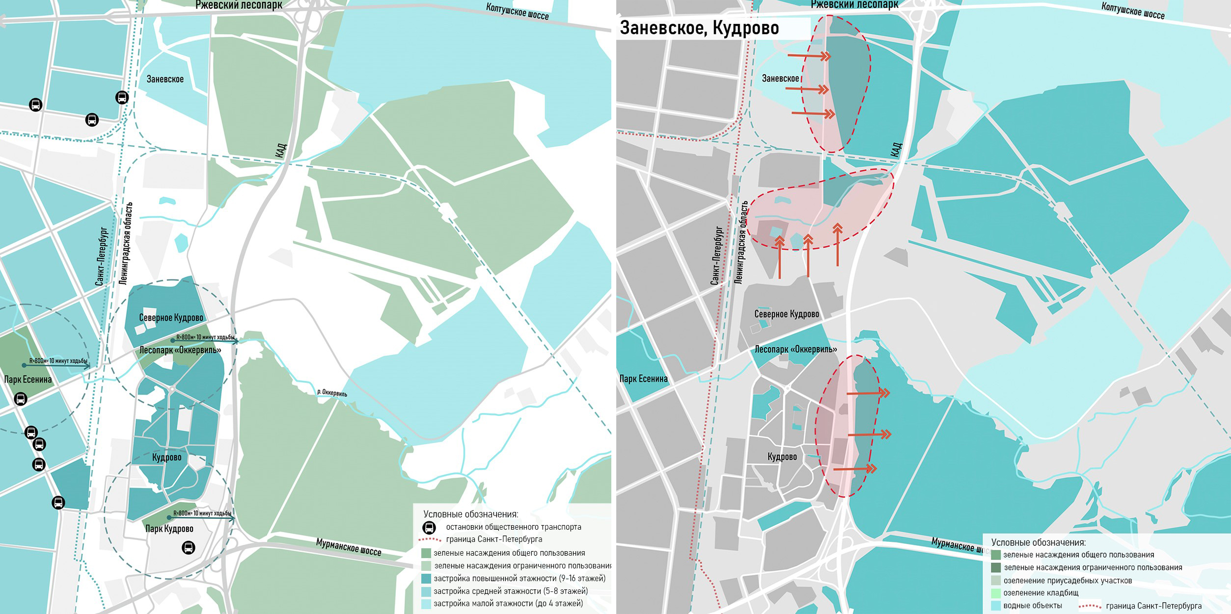 Рис. 1. Схема пешеходной доступности зеленых зон. Выявление проблематики территории Кудрово