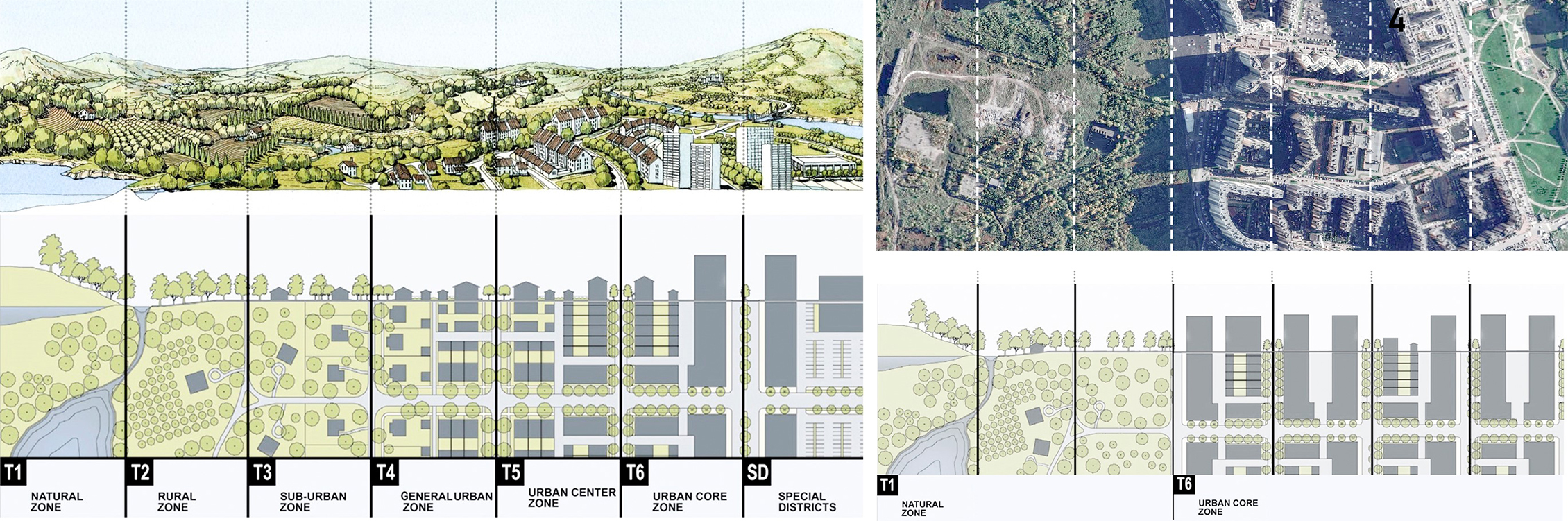 На рис. 2 представлена стандартная матрица разрезов кода на основе форм от природной зоны до особого района, которая определяет иерархические масштабы развития. Т1 представляет собой природную зону без каких-либо искусственных построек. Т2-Т6 описывают постоянное улучшение искусственного перехода от менее урбанизированной среды к высокоплотной застройке. На основе определения типов зон могут быть созданы модели для описания кода на основе форм на концептуальной стадии зонирования [5].