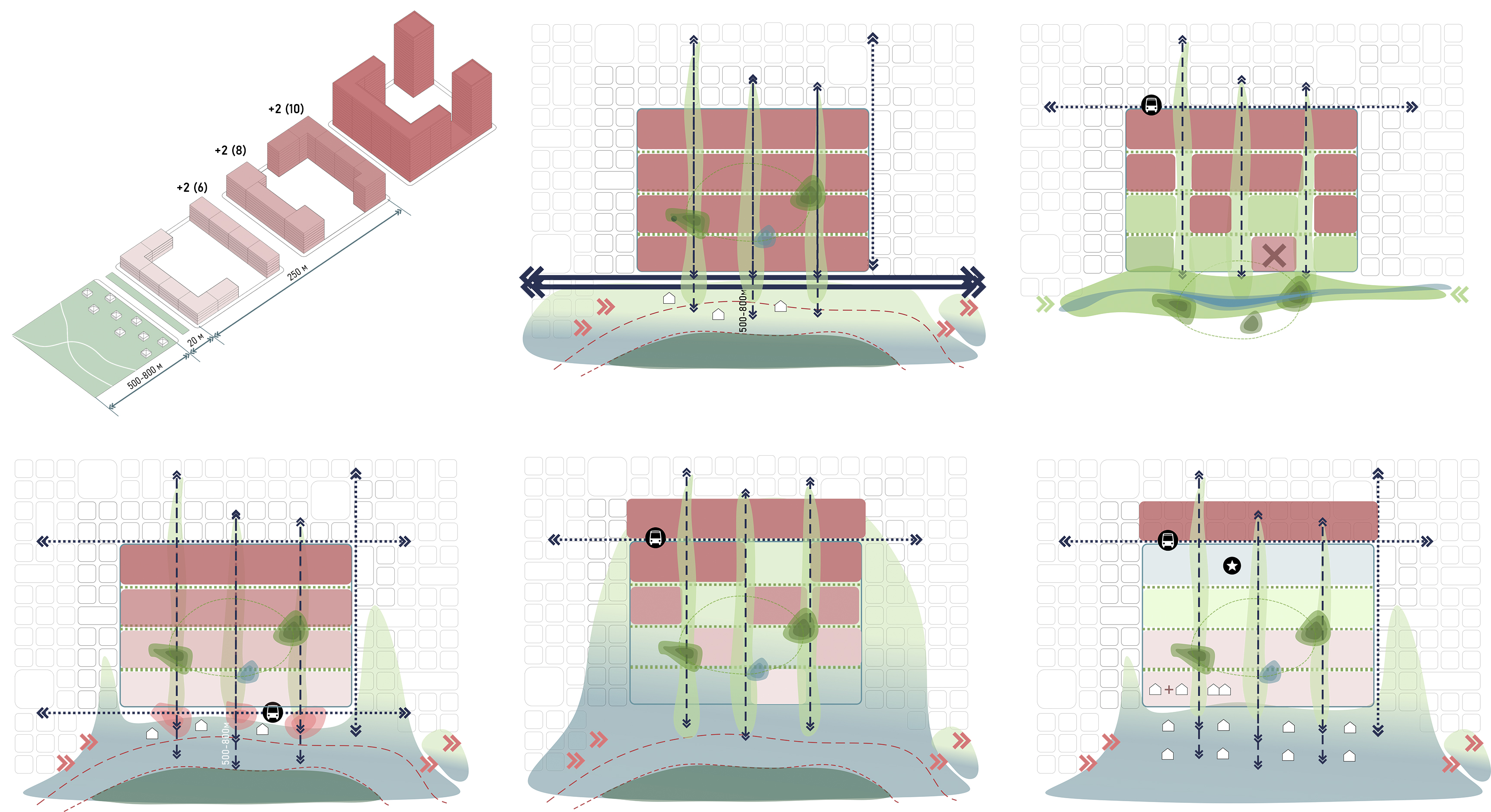 Зона регулирования застройки позволяет разнообразить типологию зданий, плотность и гибкость условий для комфортной жизни. Диктуя различные конфигураций блоков на основе этажности, модель позволяет реализовать множество потенциальных стилей жизни и архитектурно‐эстетических сценариев в пределах максимально доступной для строительства зоны. При этом градиент типологии зданий, от высотного жилого дома до дома на одну семью, может успешно сосуществовать на одном и том же участке земли, одновременно обеспечивая вариативность жилья для различных социальных групп.