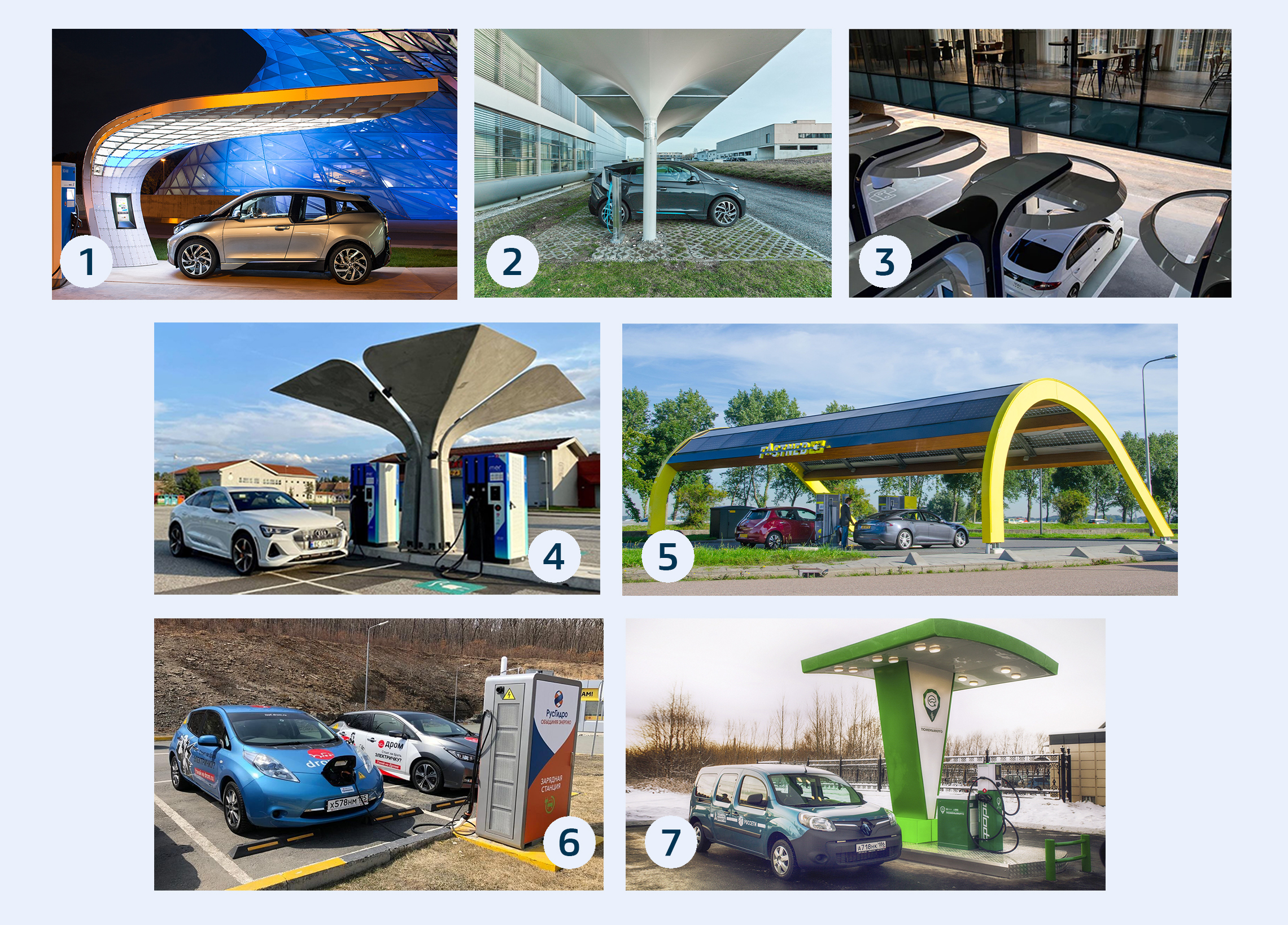 Рис. 3. Примеры решений инфраструктуры зарядных станций: 1 – зарядная станция EIGHT Point One S для музея BMW AG в Мюнхене, студия LAVA; 2 – зарядная станция, студия MDT-Tex; 3 – зарядная станция, Сеул, дизайн-студия от Huyndai Motor Company; 4 – зарядный комплекс норвежской компании MER; 5 – зарядный комплекс европейской компании Fastned; 6 – зарядная станция на базе возобновляемых источников (ГЭС) «РусГидро» во Владивостоке; 7 – зарядная станция компании ТюменьЭнерго в Югре
