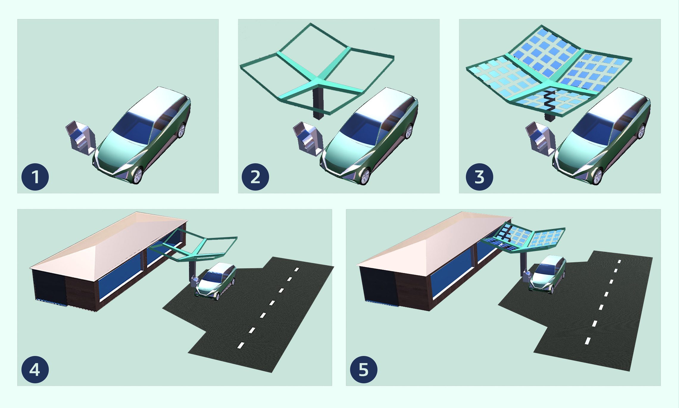 Рис. 4. Возможные типы электрозарядных станций: 1 – обычный терминал без дополнительных функций; 2 – терминал с модульным защитным навесом; 3 – терминал с модульным навесом из солнечных батарей; 4 – терминал с наличием зоны обслуживания автомобилистов (зона ожидания, кафетерий, магазин, ремонтная зона для автомобилей); 5 – терминал с наличием зоны обслуживания автомобилистов и применением углеродно-нейтральных альтернативных источников энергии