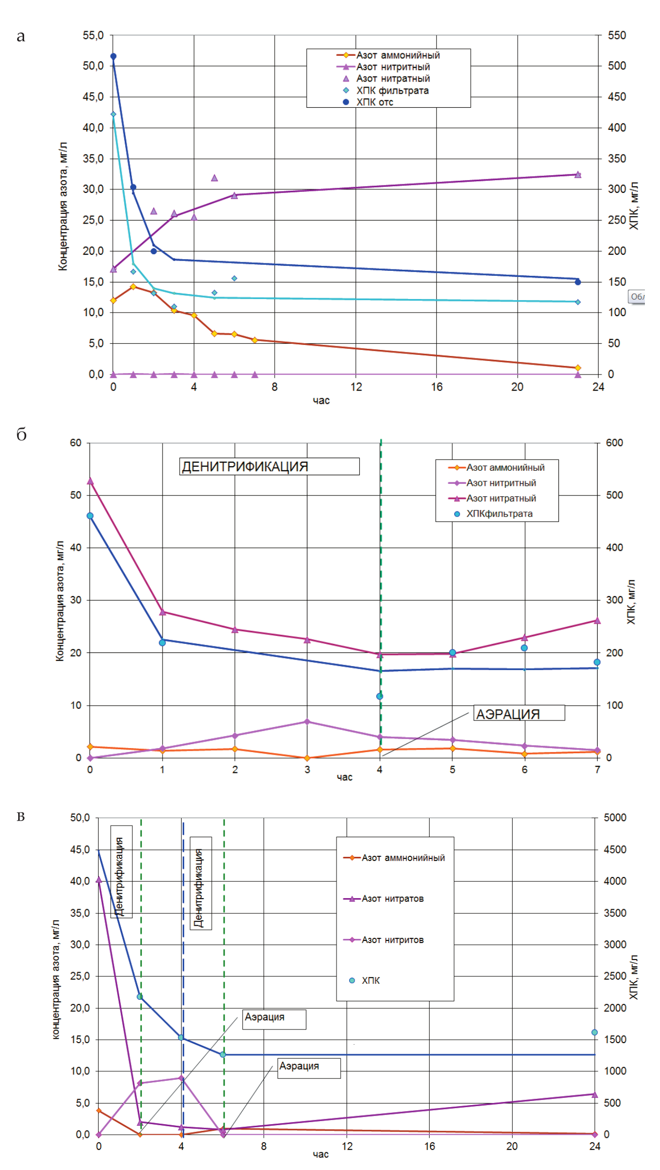 На рис. 1 представлено детальное изменение органических веществ и соединений азота в аэробном (а), аноксидно-аэробном (б), двойном чередовании аноксидных и аэробных режимов (в).