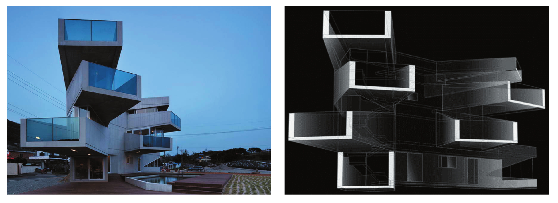 Архитектурной студией «AND» было разработано здание отеля «Aggrenad» (рис. 4). Здание расположено на острове Кодже в Южной Корее, имеет консольные этажи длиной 10 м, направленные в разные стороны. Консоли представляют собой монолитные железобетонные балки, выполненные в виде швеллера с небольшим уклоном от основания к краю.