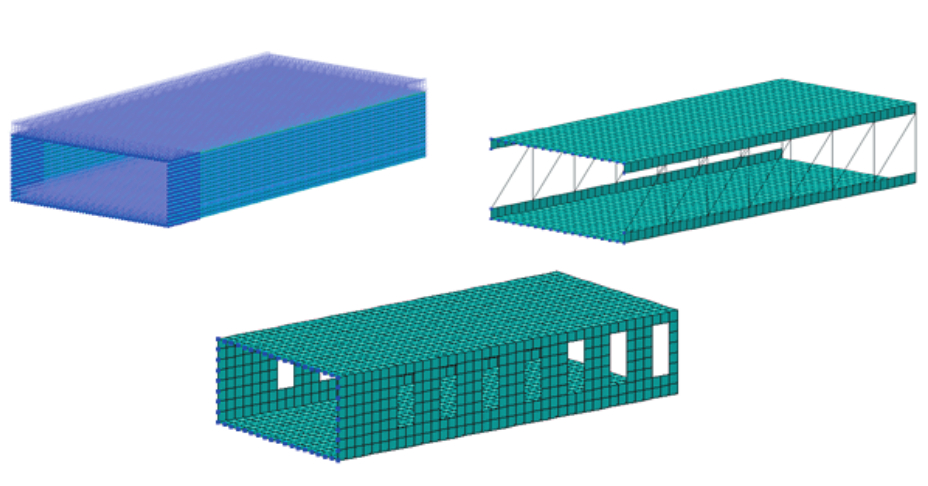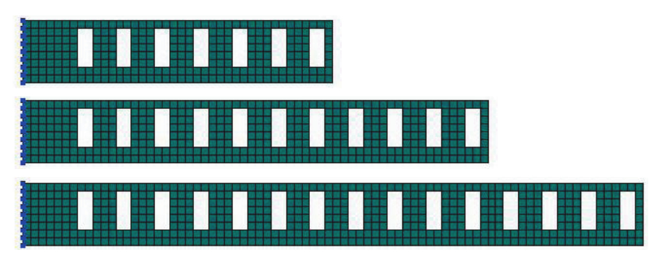Рис. 7. КЭ модели одноэтажных консолей коробчатого сечения пролетом 21, 30 и 39 м