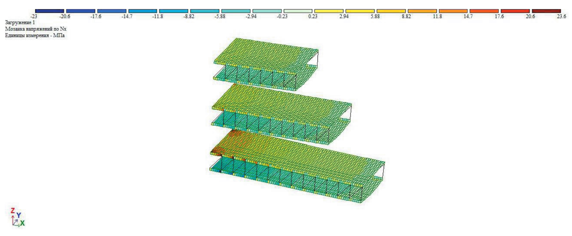 Рис. 9. Мозаика напряжений Nx (МПа) консолей пролетом 21, 30 и 39 м