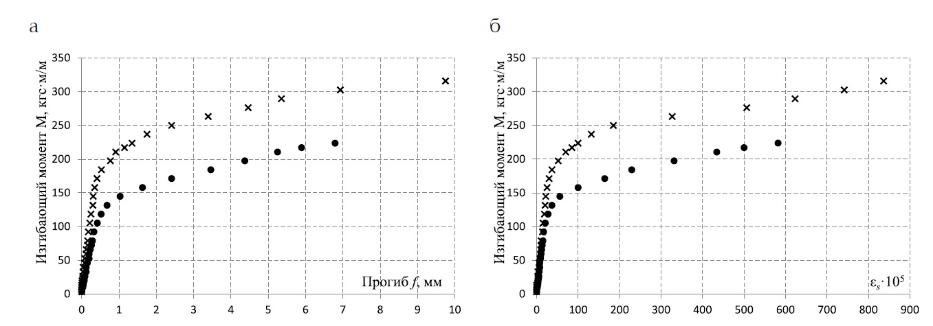 Рис. 3. Экспериментальная зависимость «изгибающий момент M – прогиб f» (а) и «изгибающий момент M – средние деформации арматуры растянутой зоны εs» (б):