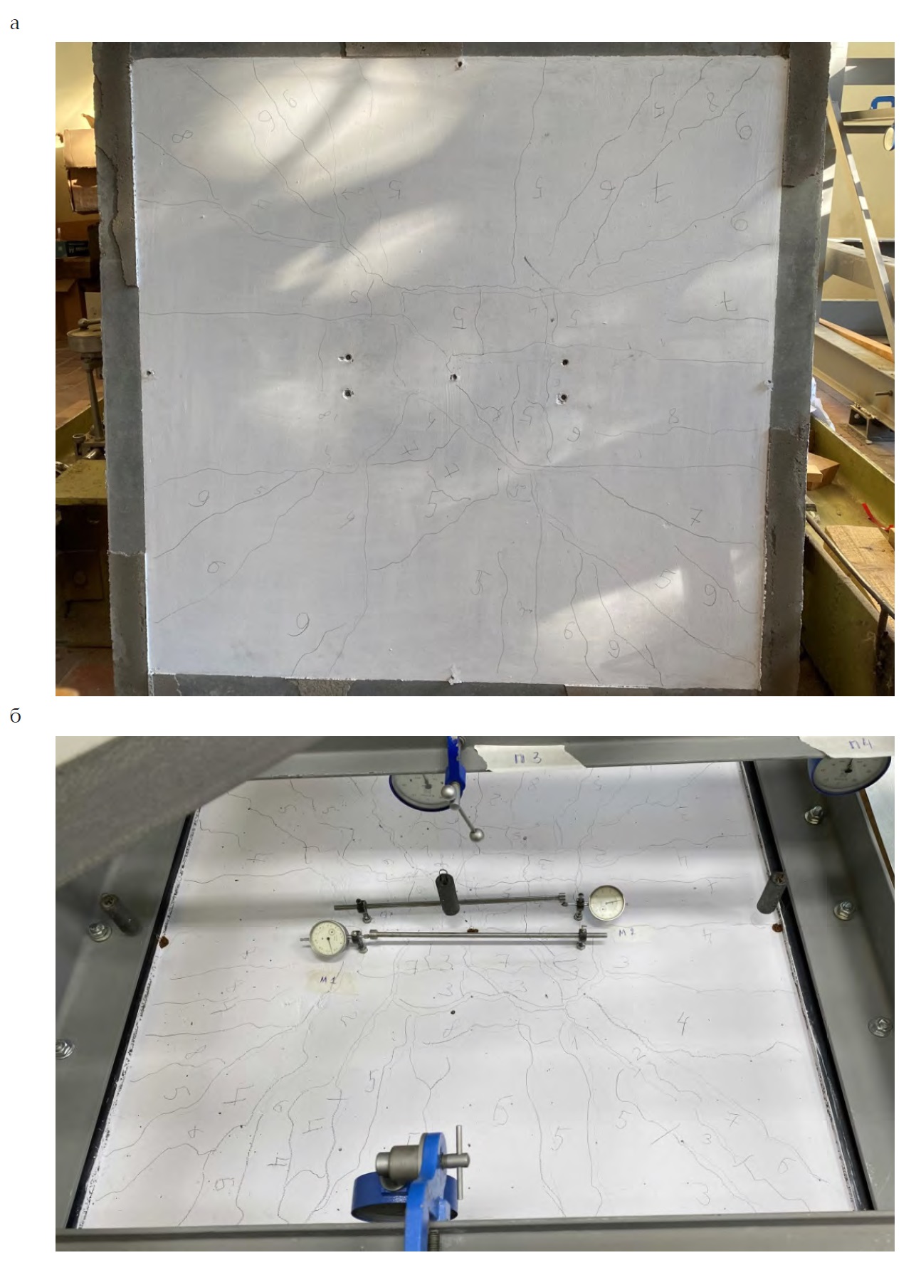 Характер развития трещин для двух моделей также оказался различным. В плите сплошного сечения первые трещины образовались параллельно торцевым плоскостям элемента с последующим появлением диагональных трещин (рис. 4, а). В модели со сферическими пустотообразователями последовательность развития трещин была иной: первые трещины образовались по диагонали плиты, а последующие – параллельно боковым граням (рис. 4, б). Общее число трещин при достижении максимальной нагрузки на облегченную модель плиты превышало количество трещин в эталонной плите сплошного сечения.