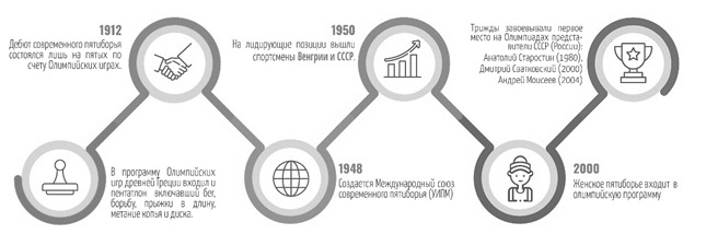 Многостороннему развитию подрастающего поколения в спорте способствует современное пятиборье. Это комплексное сочетание пяти спортивных дисциплин, каждая из которых отличается от остальных: бег, плавание, фехтование, стрельба, конкур. Пятиборье – едва ли не единственный вид спорта, созданный специально для Олимпийских игр, хотя неоднократно современное пятиборье предлагали исключить из олимпийской программы, так как оно популярно в основном в Европе (где регулярно проходят чемпионаты континента), а в России почти не развивалось [1−3] (рис. 2).