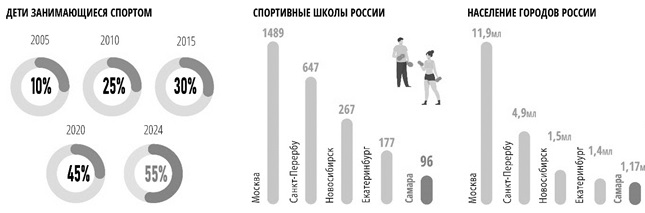 Реализация профессионального спортивного образования ставит задачу корректировки учебных общеобразовательных планов и программ, развития учебного процесса. Следовательно, перед проектировщиками возникает необходимость нового взгляда на принятие объемно-планировочных решений для данного типа многофункционального спортивного объекта. Грамотная организация пространства должна максимально создавать комфортное пребывание всем возрастным категориям учащихся и преподавателям, способствовать возможности раскрытия спортивного потенциала. В исследовании были проанализированы процентные соотношения существующих спортивных школ и количества детей, занимающихся спортом в крупнейших городах России (рис. 3).