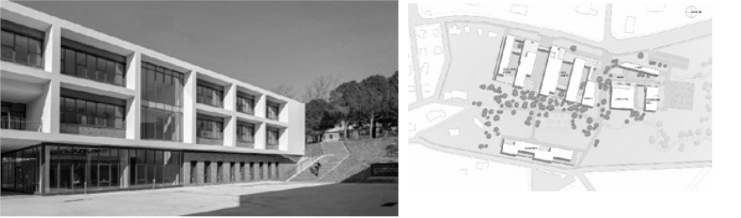 Общие зоны, художественные и музыкальные комнаты, лаборатории, мастерские, кафетерий создают проницаемый первый этаж, который полностью остеклен и имеет сквозной проход через дворы [14, 15]. Большие объемы, такие как спортивный центр и конференц-зал, наполовину заглублены в результате разницы уровней, чтобы поддерживать среду человеческого масштаба по отношению к окружающей среде (рис. 5).