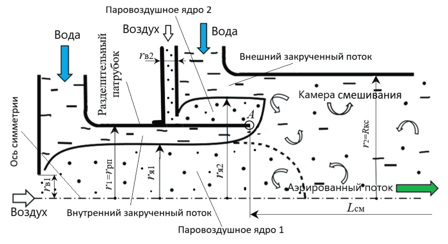 Течение внутреннего и внешнего закрученных потоков воды в контрвихревом аэраторе происходит в виде двух обособленных кольцевых течений, показанных на рис. 1. Их геометрические параметры следующие: r1 и r2 – наружные радиусы соответственно внутреннего и внешнего закрученных потоков, rя1 и rя2 – радиусы паровоздушного ядра этих потоков. Кольцевые течения состоят из воды, а в приосевых зонах этих течений находятся паровоздушные массы. В концевой точке разделительного патрубка (точка А на рис. 1) внутренний и внешний противоположно закрученные потоки встречаются и начинают взаимодействовать в цилиндрической камере смешивания с радиусом r1 = Rкс. В камере смешивания за счёт сил вязкости генерируется повышенная турбулентность, которая приводит к интенсивной аэрации водного потока мелкодисперсными пузырьками воздуха. При этом многократно ускоряется процесс растворения кислорода воздуха в воде за счёт резкого увеличения площади контакта газовой и жидкостной фаз.