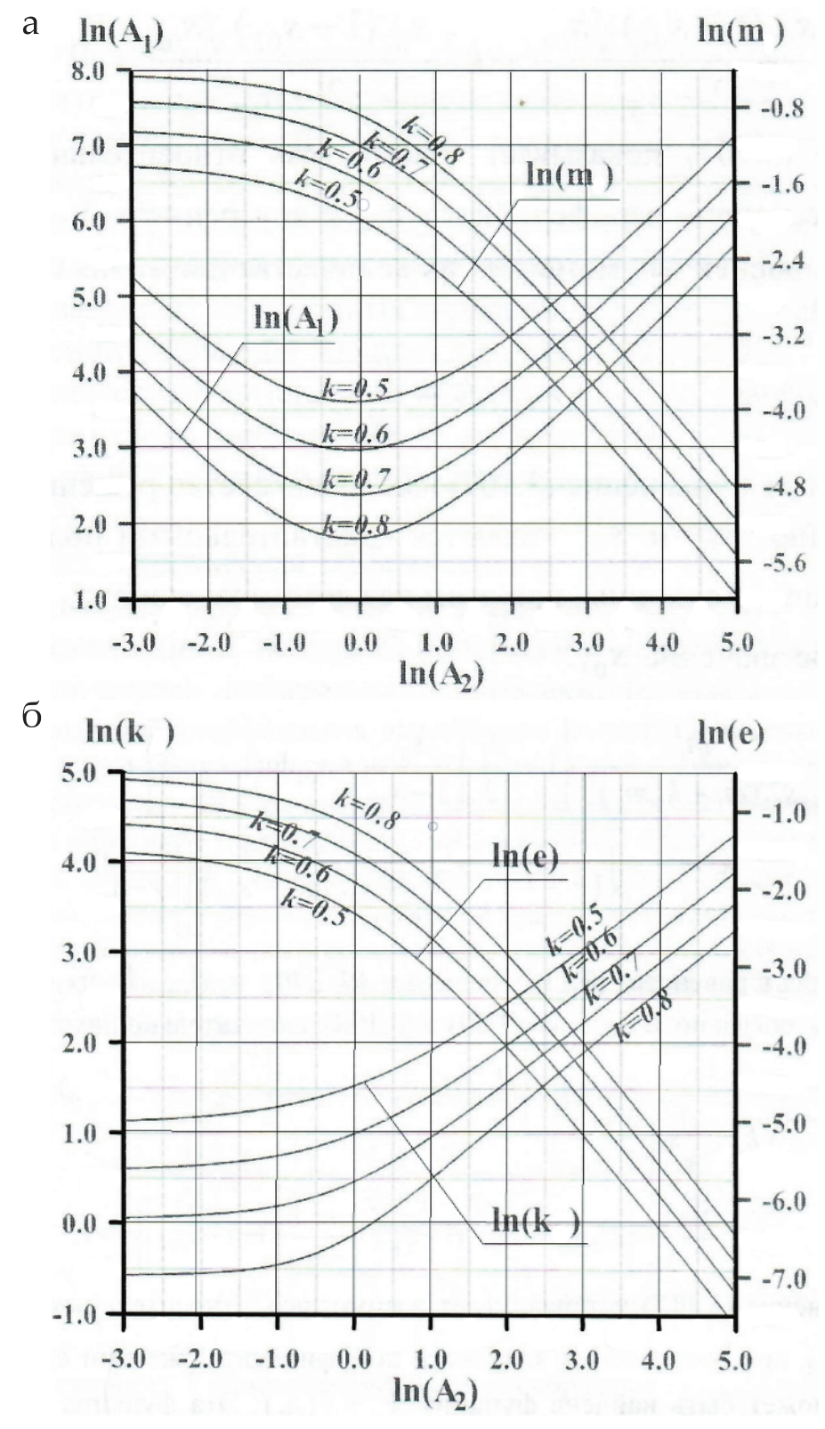 Рис. 2. Номограммы для графоаналитического определения параметров аэратора: а – параметры ln(А1) и ln(т) в функции ln(А2); б – параметры ln(k) и ln(e) в функции ln(А2)