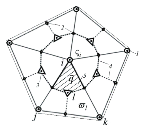 Рис. 3. Элемент расчетной области: 1 – узлы; 2 – середины сторон треугольников; 3 – центры тяжести треугольников; 4 – граница шаблона для ζ; 5 – пересечение шаблонов для ζ и