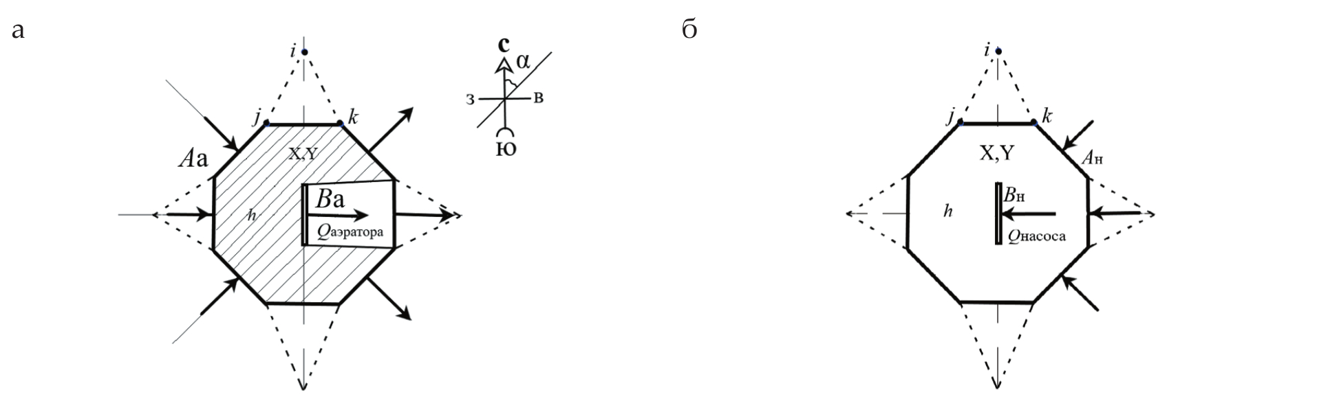 Далее необходимо в численной модели и её расчётной области сформировать участки для работы аэратора и насоса. Схемы этих участков на треугольной сетке показаны на рис. 4. Фрагмент участка, где расположен аэратор, можно представить в виде восьмигранника, со сторонами jk, который моделирует начальный участок взаимодействия струи аэратора с водоёмом. Участок привязан на расчётной области водоёма координатами Xa, Ya. В пределах восьмигранника (заштрихован на схеме рис. 4, а) расположена грань Ba, имитирующая струйный аэратор с производительностью Qa направлением истечения струи, ориентированной по сторонам света и глубиной водоёма h в месте установки аэратора. На границе Aa (грани на противоположной стороне восьмигранника) задаётся производительность струи аэратора с обратным знаком по отношению к Qa. Заштрихованная область вырезает из расчетной области на треугольной сетке участок взаимодействия струи аэратора с массой жидкости в водоеме. который не моделируется в рамках рассмотренной модели.