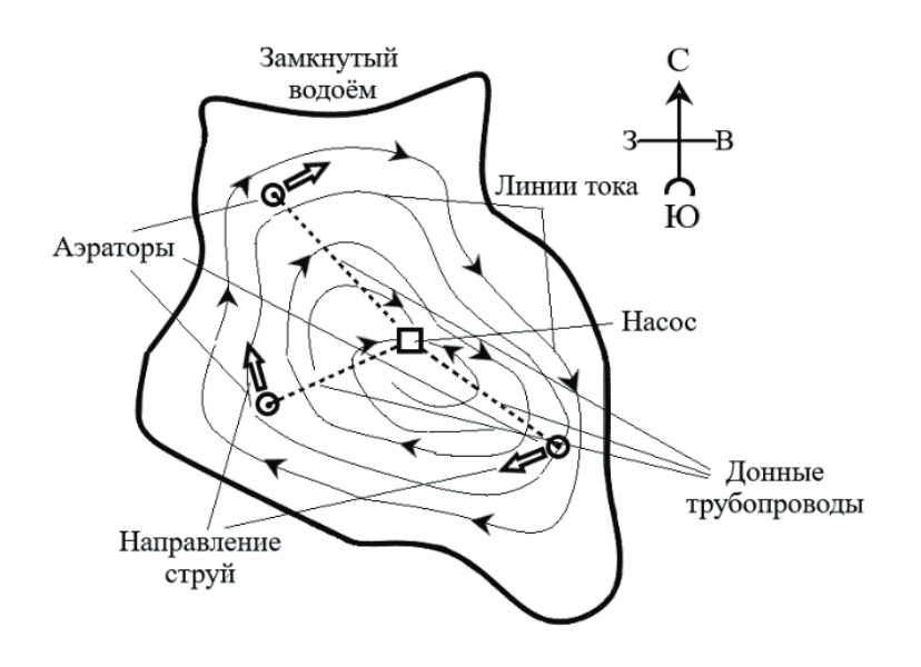 Рис. 5. Пример организации искусственных циркуляционных течений в замкнутом водоёме