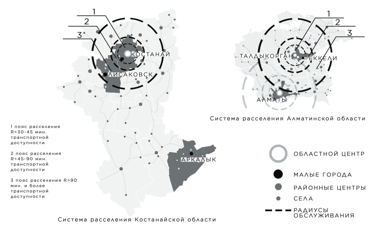 Рис. 2. Схемы системы расселения Костанайской и Алматинской областей