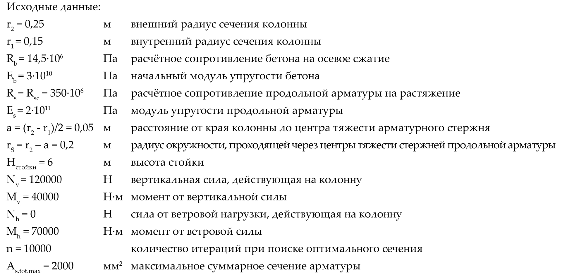 Данная работа направлена на автоматизацию определения минимально возможной площади сечения арматуры при условии соблюдения требований по устойчивости и прочности внецентренно сжатых колонн кольцевого сечения.