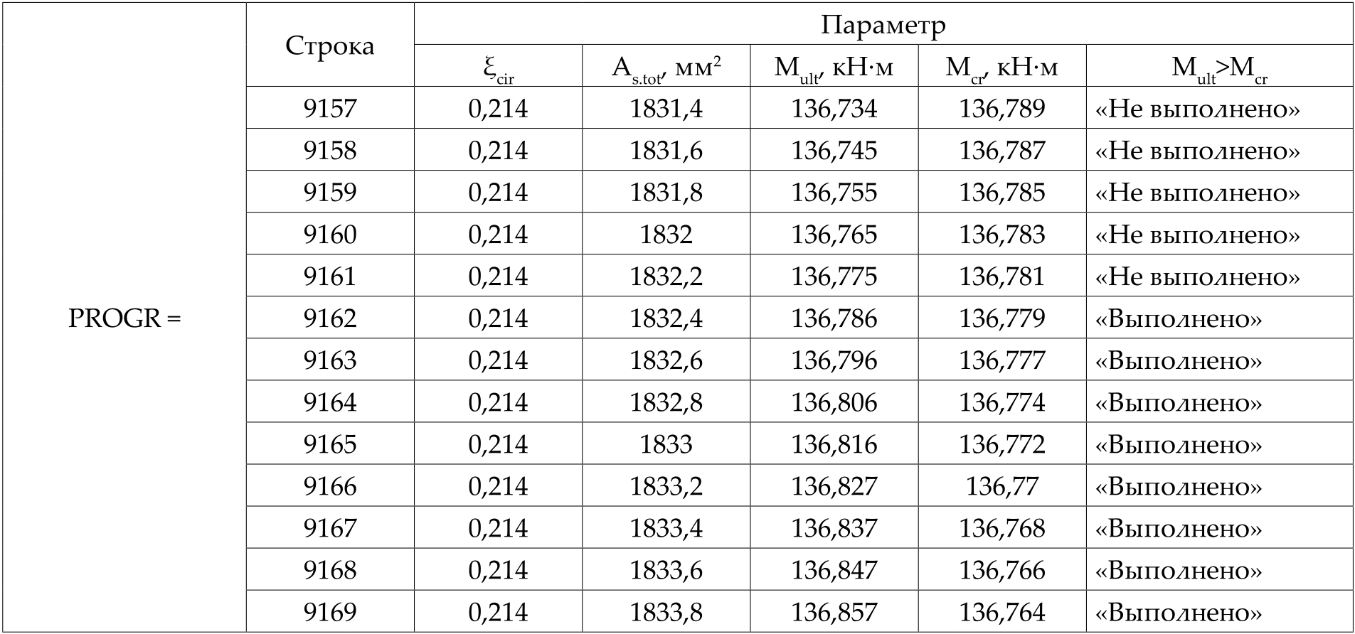 Данный алгоритм также построен на описанной в своде правил (СП 63.13330.2018) методике. Помимо используемого алгоритма, программа отличается от предыдущей и выходными данными, которые представлены в виде таблицы (рис. 4).