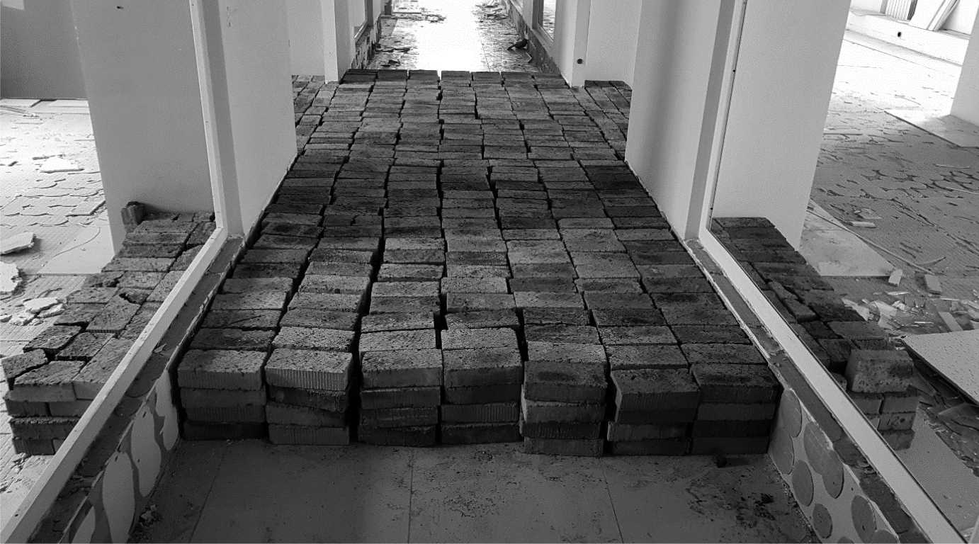 Загружение выполнялось ступенчато: четыре ступени по 80 кг/м2. После каждой ступени нагружения перекрытие выдерживалось не менее 15 минут. На каждой ступени снимались показания прогибомеров, а также производился осмотр конструкций снизу на предмет образования трещин. Велась фотосъемка. После загружения полной нагрузкой (320 кг/м2 – для коридора и 240 кг/м2 – для офисного помещения) перекрытие выдерживалось под нагрузкой трое суток.